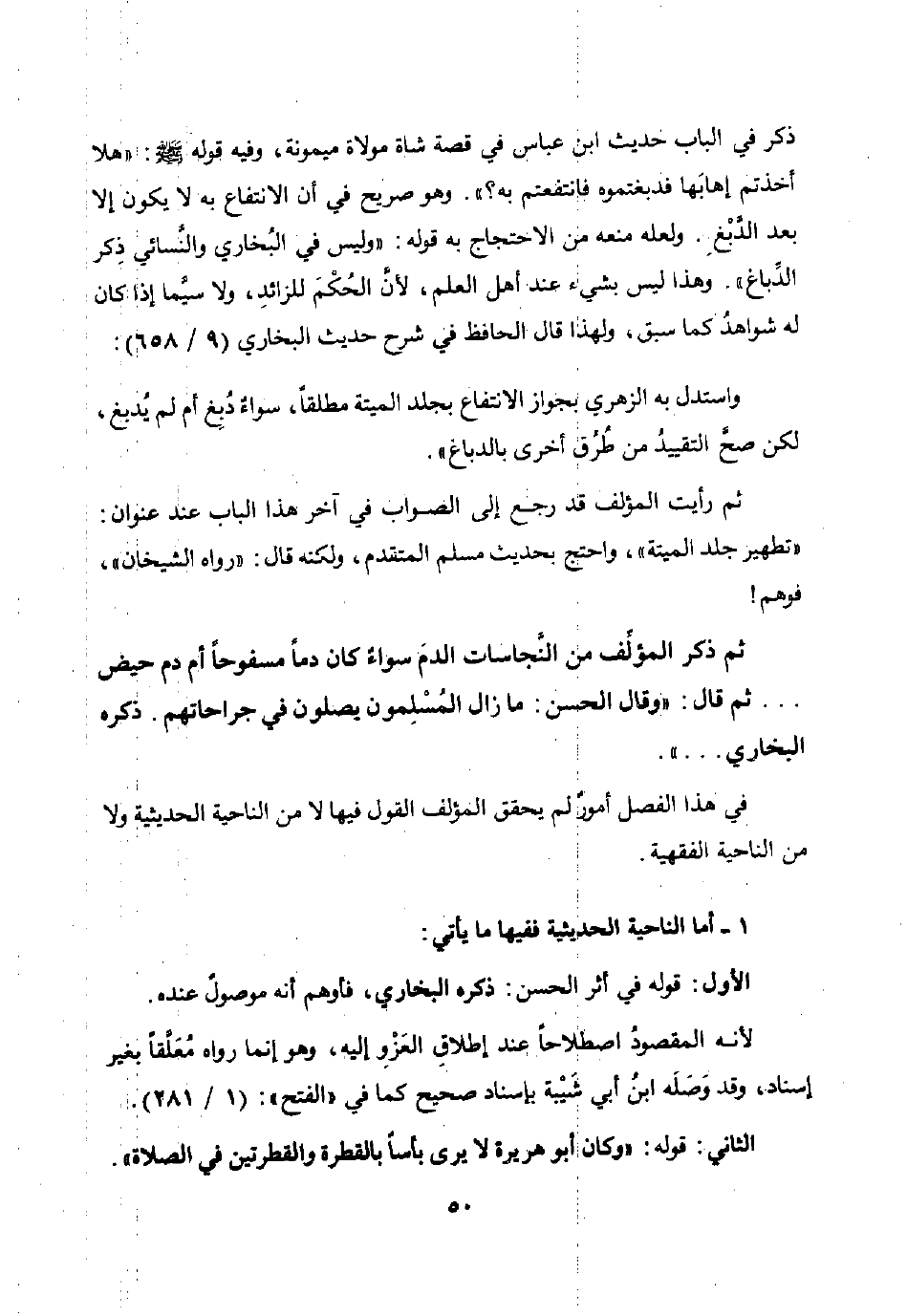 ذكر في الباب حديث ابن عباس في قصة شاة مولاة ميمونة وفيه قوله صلى الله عليه وسلم: "هلا أخذتم إهابها فدبغتموه فانتفعتم به؟ ". وهو صريح في أن الانتفاع به لا يكون إلا بعد الدبغ. ولعله منعه من الاحتجاج به قوله: "وليس في البخاري والنسائي ذكر الدباغ". وهذا ليس بشيء عند أهل العلم لأن الحكم للزائد ولا سيما إذا كان له شواهد كما سبق ولهذا قال الحافظ في شرح حديث البخاري 9 / 658: واستدل به الزهري بجواز الانتفاع بجلد الميتة مطلقا سواء دبغ أم لم يدبغ لكن صح التقييد من طرق أخرى بالدباغ"