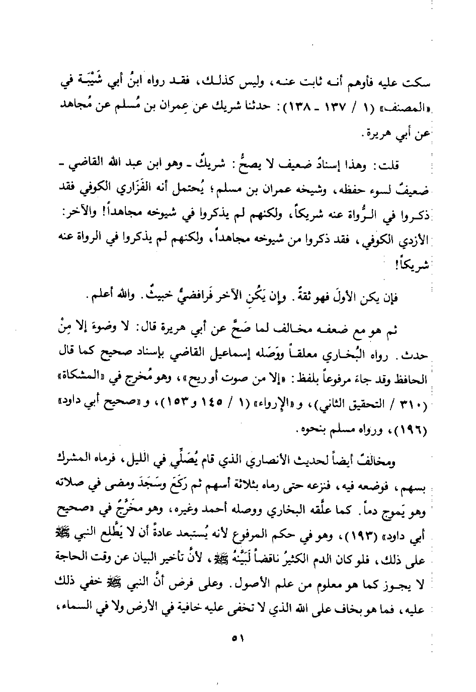 ومخالف أيضا لحديث الأنصاري الذي قام يصلي في الليل فرماه المشرك بسهم فوضه فيه فنزعه حتى رماه بثلاثة أسهم ثم ركع وسجد ومضى في صلاته وهو يموج دما. كما علقه البخاري ووصله أحمد وغيره وهو مخرج في "صحيح أبي داود" 193 وهو في حكم المرفوع لأنه يستبعد عادة أن لا يطلع النبي صلى الله عليه وسلم على ذلك فلو كان الدم الكثير ناقضا لبينه صلى الله عليه وسلم لأن تأخير البيان عن وقت الحاجة لا يجوز كما هو معلوم من علم الأصول. وعلى فرض أن النبي صلى الله عليه وسلم خفي ذلك عليه فما هو بخاف على الله الذي لا تخفى عليه خافية في الأرض ولا في السماء