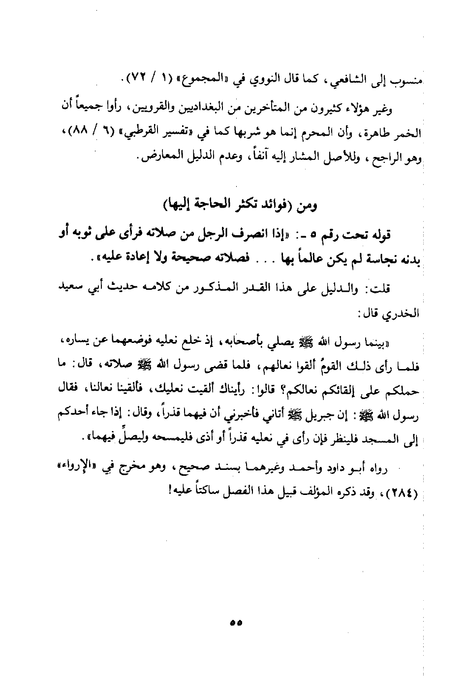 بينما رسول الله صلى الله عليه وسلم يصلي بأصحابه إذ خلع نعليه فوضعهما عن يساره فلما رأى ذلك القوم ألقوا نعالهم فلما قضى رسول الله صلى الله عليه وسلم صلاته قال: "ما حملكم على إلقائكم نعالكم؟ " قالوا: رأيناك ألقيت نعليك فألقينا نعالنا فقال رسول الله صلى الله عليه وسلم: "إن جبريل صلى الله عليه وسلم أتاني فأخبرني أن فيهما قذرا" وقال: "إذا جاء أحدكم إلى المسجد فلينظر فإن رأى في نعليه قذرا أو أذى فليمسحه وليصل فيهما".