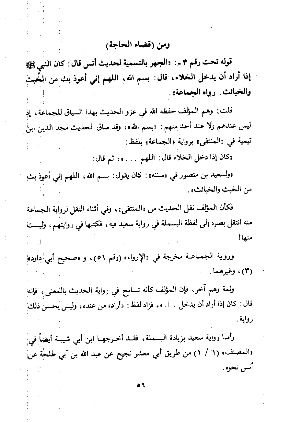 قوله تحت رقم 3 -: الجهر بالتسمية لحديث أنس قال: كان النبي صلى الله عليه وسلم إذا أراد أن يدخل الخلاء قال: "بسم الله اللهم إني أعوذ بك من الخبث والخبائث". رواه الجماعة.