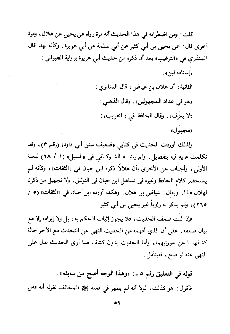 ولم يتنبه الشوكاني في "السيل" 1 / 68 للعلة الأولى وأجاب عن الأخرى بأن هلالا ذكره ابن حبان في "الثقات" وكأنه لم يستحضر كلام الحافظ وغيره في تساهل ابن حبان في التوثيق ولا تجهيل من ذكرنا لهلال هذا ويقال: عياض بن هلال. وهكذا أورده ابن حبان في "الثقات" 5 / 265 ولم يذكر له راويا غير يحيى بن أبي كثير!