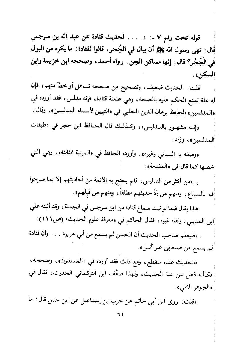 قوله تحت رقم 7 -: ... لحديث قتادة عن عبد الله بن سرجس قال: نهى رسول الله صلى الله عليه وسلم أن يبال في الجحر قالوا لقتادة: ما يكر من البول في الجحر؟ قال: "إنها مساكن الجن". رواه أحمد وصححه ابن خزيمة وابن السكن.