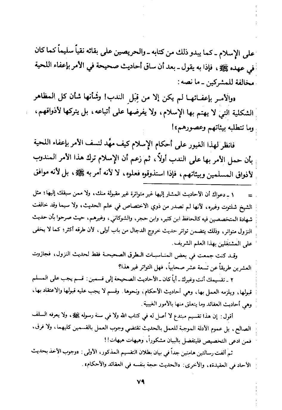 على الإسلام - كما يبدو ذلك من كتابه - والحريصين على بقائه نقيا سليما كما كان في عهده صلى الله عليه وسلم فإذا به يقول - بعد أن ساق أحاديث صحيحة في الأمر بإعفاء اللحية مخالفة للمشركين - ما نصه: