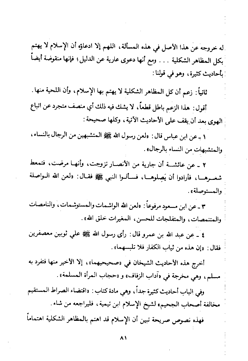 له خروجه عن هذا الأصل في هذه المسألة اللهم إلا ادعاؤه أن الإسلام لا يهتم بكل المظاهر الشكلية ... ومع أنها دعوى عارية عن الدليل فإنها منقوضة أيضا بأحاديث كثيرة وهو في قولنا: