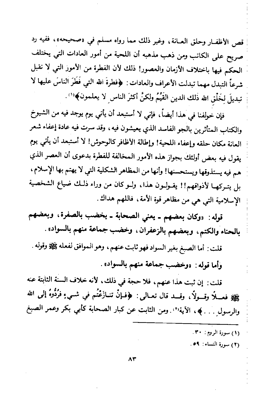 قص الأظفار وحلق العانة وغير ذلك مما رواه مسلم في "صحيحه" ففيه رد صريح على الكاتب ومن ذهب مذهبه أن اللحية من أمور العادات التي يختلف الحكم فيها باختلاف الأزمان والعصور ذلك لأن الفطرة من الأمور التي لا تقبل شرعا التبدل مهما تبدلت الأعراف والعادات: {فِطْرَتَ اللَّهِ الَّتِي فَطَرَ النَّاسَ عَلَيْهَا لا تَبْدِيلَ لِخَلْقِ اللَّهِ ذَلِكَ الدِّينُ الْقَيِّمُ وَلَكِنَّ أَكْثَرَ النَّاسِ لا يَعْلَمُونَ} 1.