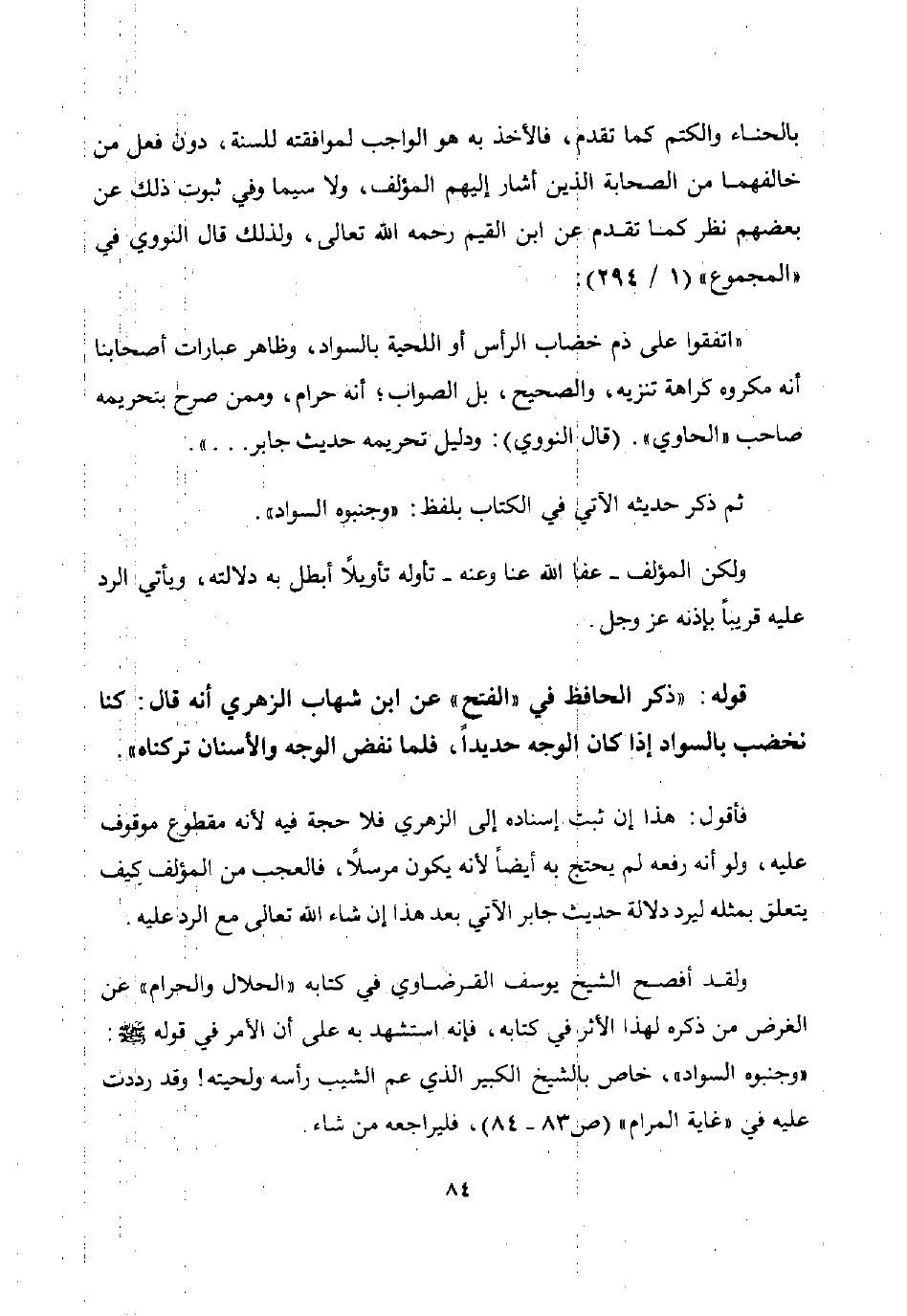 ولقد أفصح الشيخ يوسف القرضاوي في كتابه "الحلال والحرام" عن الغرض من ذكره لهذا الأثر في كتابه فإنه استشهد به على أن الأمر في قوله صلى الله عليه وسلم: "وجنبوه السواد" خاص بالشيخ الكبير الذي عم الشيب رأسه ولحيته وقد رددت عليه في "غاية المرام" ص 83 - 84 فليراجعه من شاء.