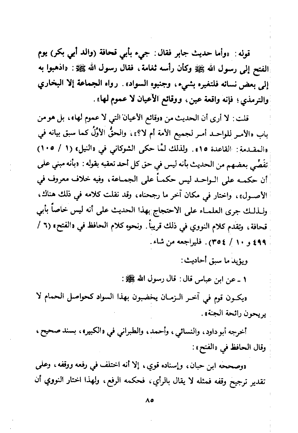 قلت: لا أرى أن الحديث من "وقائع الأعيان التي لا عموم لها" بل هو من باب "الأمر للواحد أمر لجميع الأمة أم لا؟ " " والحق الأول كما سبق بيانه في "المقدمة: القاعدة 15". ولذلك لما حكى الشوكاني في "النيل" 1 / 105 تفصي بعضهم من الحديث بأنه ليس في حق كل أحد تعقبه بقوله: "بأنه مبني على أن حكمه على الواحد ليس حكما على الجماعة وفيه خلاف معروف في الأصول" واختار في مكان آخر ما رجحناه وقد نقلت كلامه في ذلك هناك ولذلك جرى العلماء على الاحتجاج بهذا الحديث على أنه ليس خاصا بأبي قحافة وتقدم كلام النووي في ذلك قريبا. ونحوه كلام الحافظ في "الفتح" 6 / 499 و10 / 354.فليراجعه من شاء.