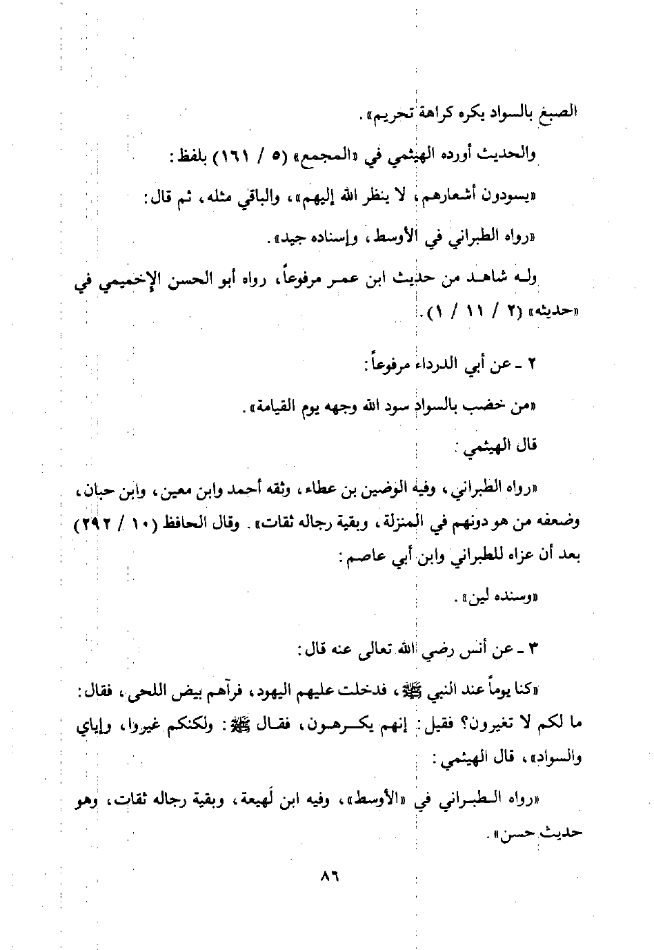 3 - عن أنس رضي الله تعالى عنه قال: كنا يوما عند النبي صلى الله عليه وسلم فدخلت عليهم اليهود فرآهم بيض اللحى فقال: "ما لكم لا تغيرون؟ " فقيل: إنهم يكرهون فقال في صلى الله عليه وسلم: "ولكنكم غيروا وإياي والسواد" قال الهيثمى: