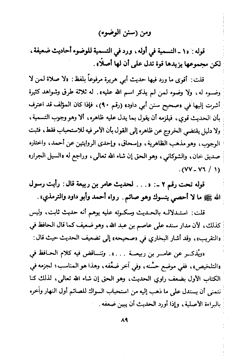 "ويذكر عن عامر بن ربيعة ... ". وتناقض فيه كلام الحافظ في "التلخيص" ففي موضع حسنه وفي آخر ضعفه وهذا هو المناسب لجزمه في الكتاب الأول بضعف راوي الحديث وهو الحق إن شاء الله تعالى لذلك كنا نتمنى أن يستدل على ما ذهب إليه من استحباب السواك للصائم أول النهار وآخره بالبراءة الأصلية وإذا أورد الحديث أن يبين ضعفه.