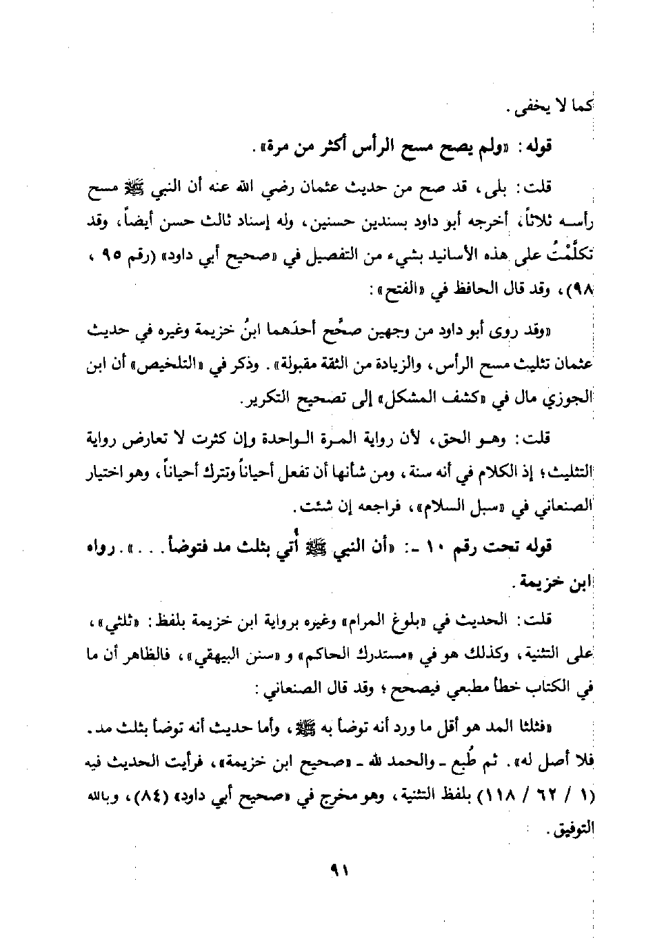 قلت: بلى قد صح من حديث عثمان رضي الله عنه أن النبي صلى الله عليه وسلم مسح رأسه ثلاثا أخرجه أبو داود بسندين حسنين وله إسناد ثالث حسن أيضا وقد تكلمت على هذه الأسانيد بشيء من التفصيل في "صحيح أبي داود" رقم 95 98 وقد قال الحافظ في "الفتح":