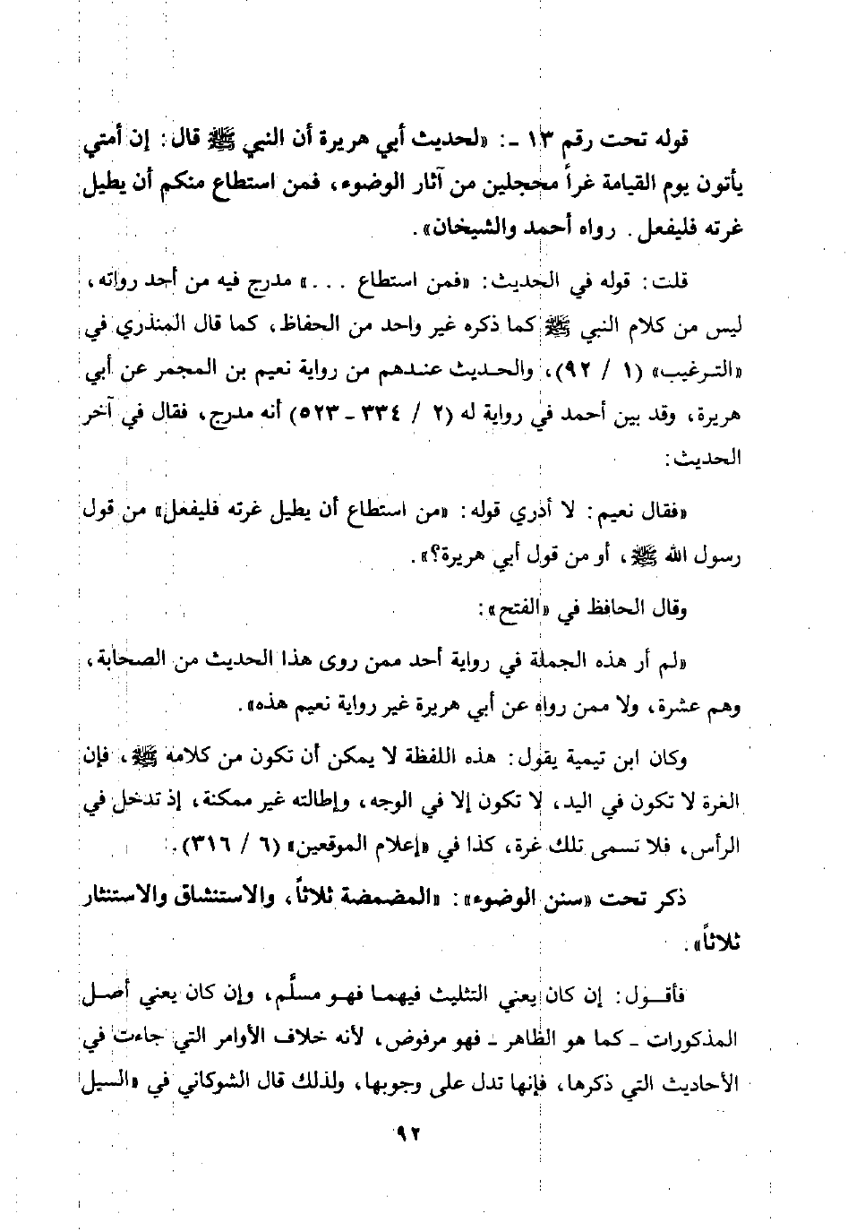 قوله تحت رقم 13 -: لحديث أبي هريرة أن النبي صلى الله عليه وسلم قال: "إن أمتي يأتون يوم القيامة غرا محجلين من آثار الوضوء فمن استطاع منكم أن يطيل غرته فليفعل". رواه أحمد والشيخان.