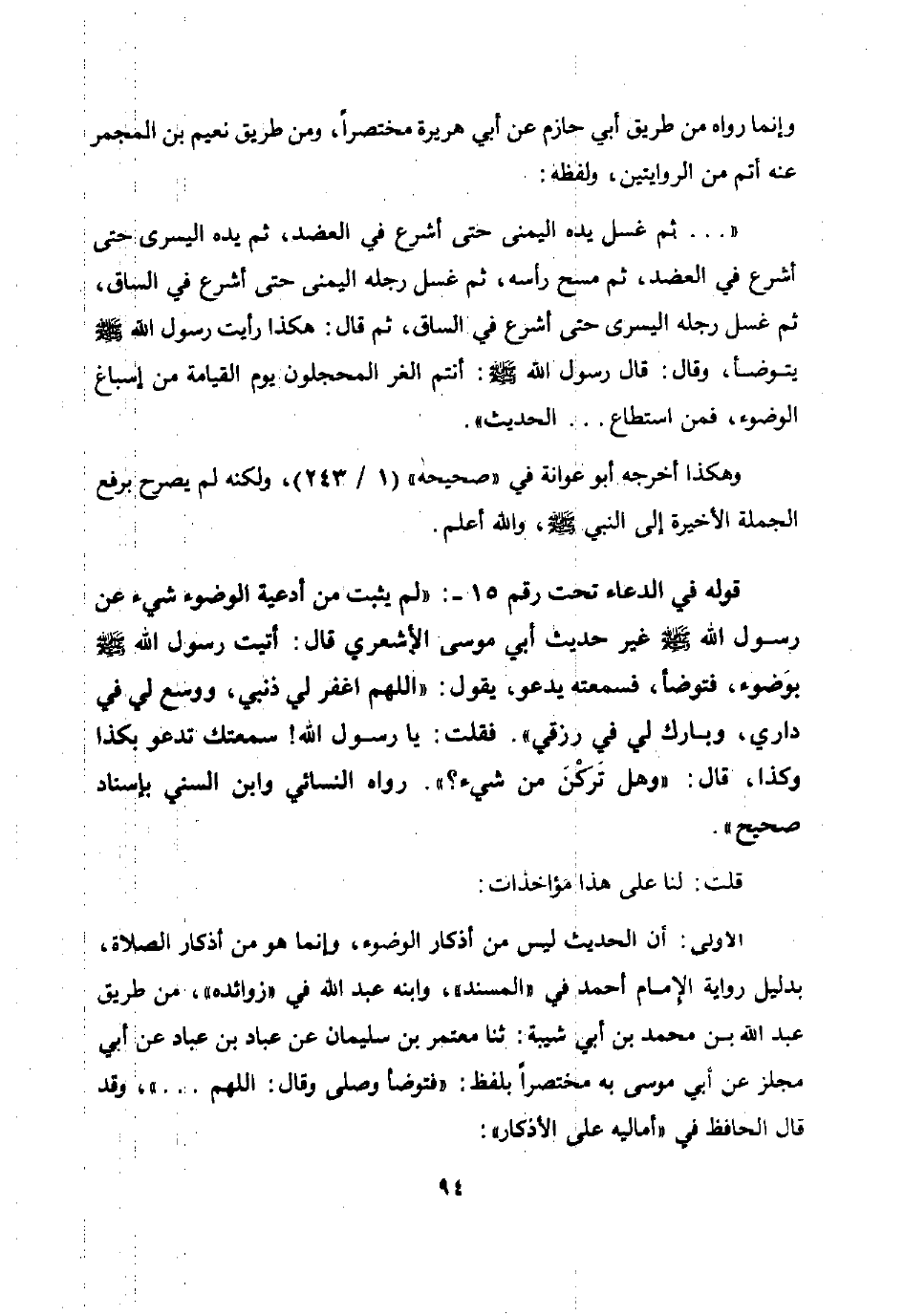 قوله في الدعاء تحت رقم 15 -: لم يثبت من أدعية الوضوء شيء عن رسول الله صلى الله عليه وسلم غير حديث أبي موسى الأشعري قال: أتيت رسول الله صلى الله عليه وسلم بوضوء فتوضأ فسمعته يدعو يقول: "اللهم اغفر لي ذنبي ووسع لي في داري وبارك لي في رزقي". فقلت: يا رسول الله سمعتك تدعو بكذا وكذا قال: "وهل تركن من شيء؟ ". رواه النسائي وابن السني بإسناد صحيح.