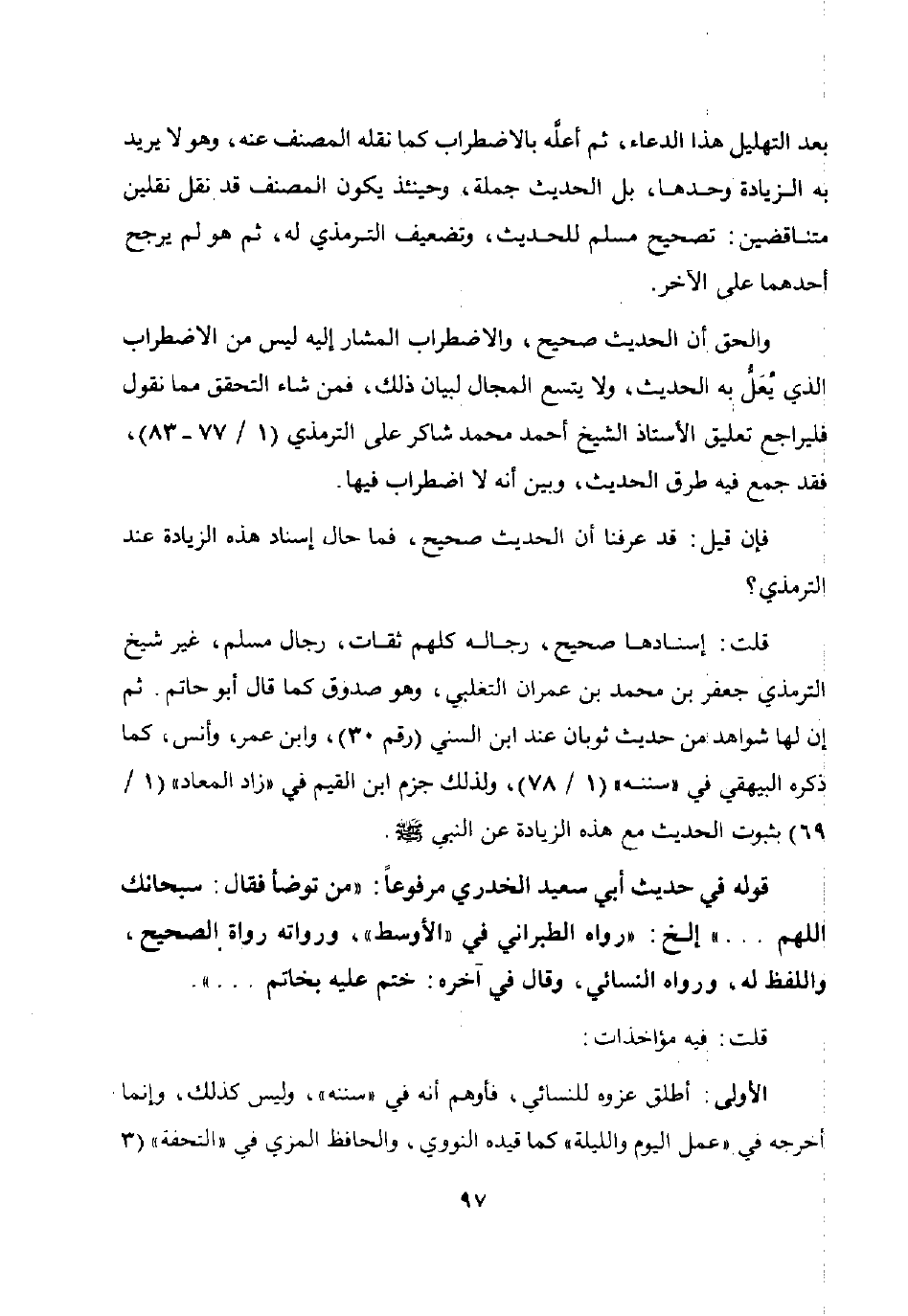 والحق أن الحديث صحيح والاضطراب المشار إليه ليس من الاضطراب الذي يعل به الحديث ولا يتسع المجال لبيان ذلك فمن شاء التحقق مما نقول فليراجع تعليق الأستاذ الشيخ أحمد محمد شاكر على الترمذي 1 / 77 - 83 فقد جمع فيه طرق الحديث وبين أنه لا اضطراب فيها.