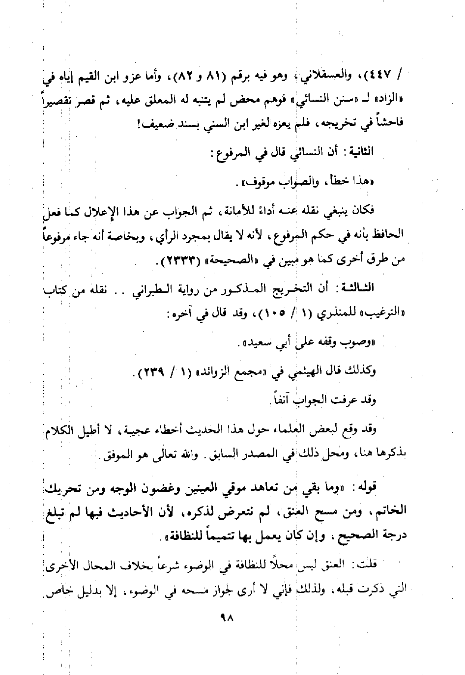 قلت: العنق ليس محلا للنظافة في الوضوء شرعا بخلاف المحال الأخرى التي ذكرت قبله ولذلك فإني لا أرى جواز مسحه في الوضوء إلا بدليل خاص