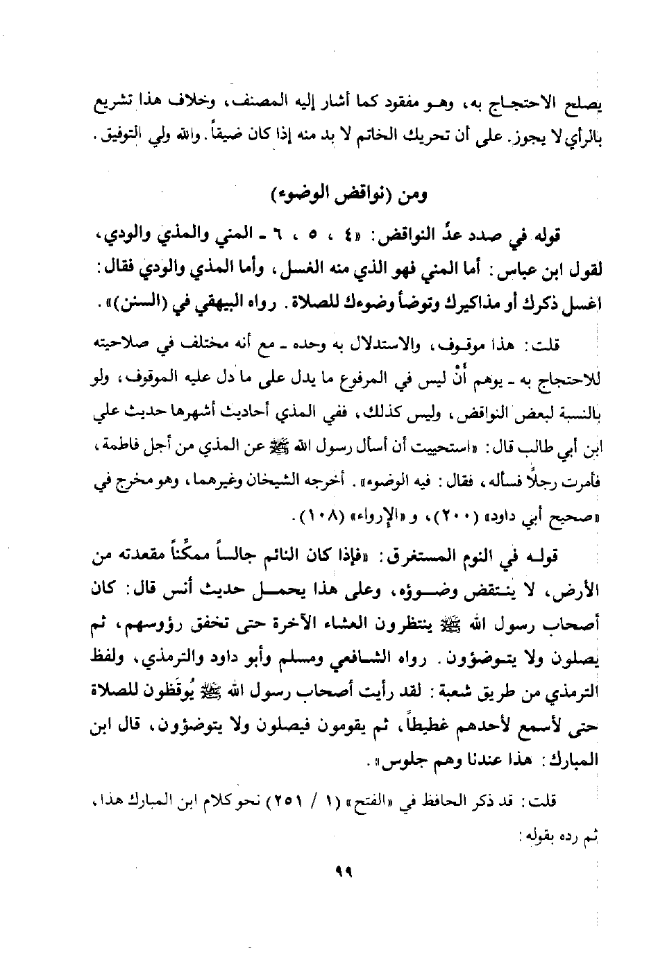 قلت: هذا موقوف والاستدلال به وحده - مع أنه مختلف في صلاحيته للاحتجاج به - يوهم أن ليس في المرفوع ما يدل على ما دل عليه الموقوف ولو بالنسبة لبعض النواقض وليس كذلك ففي المذي أحاديث أشهرها حديث علي ابن أبي طالب قال: استحييت أن أسأل رسول الله صلى الله عليه وسلم عن المذي من أجل فاطمة فأمرت رجلا فسأله فقال: "فيه الوضوء". أخرجه الشيخان وغيرهما وهو مخرج في "صحيح أبي داود" 200 و "الإرواء" 108.