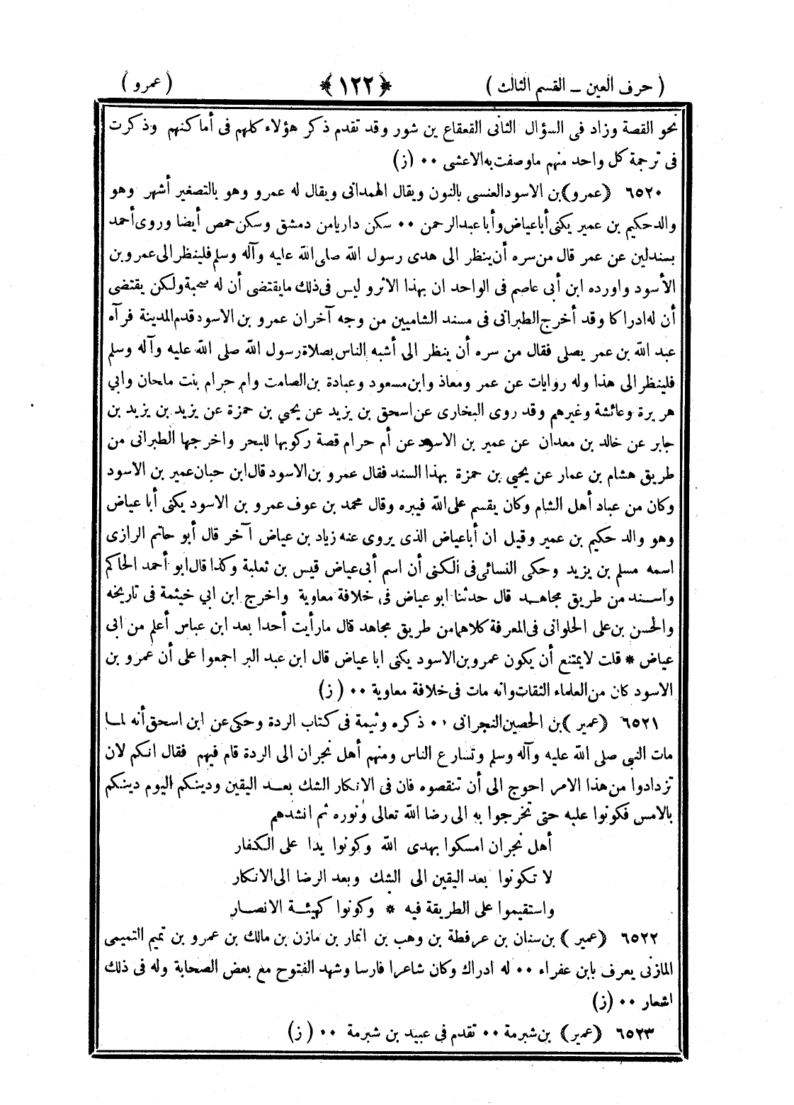 <122> نحو القصة وزاد في السؤال الثاني القعقاع بن شور وقد تقدم ذكر هؤلاء كلهم في اماكنهم وذكرت في ترجمة كل واحد منهم ما وصفت به الأعشى عمير بن الأسود العنسي بالنون ويقال الهمداني ويقال عمرو وهو بالتصغير اشهر وهو والد حكيم بن عمير يكنى أبا عياض وأبا عبد الرحمن سكن داريا من دمشق وسكن حمص أيضا وروى احمد بسند لين عن عمر قال من سره ان ينظر الى هدى رسول الله صلى الله عليه وسلم فلينظر الى عمرو بن الأسود وأورده بن أبي عاصم في الوحدان بهذا الأثر وليس في ذلك ما يقتضى ان له صحبة ولكن يقتضى ان له ادراكا وقد اخرج الطبراني في مسند الشاميين من وجه آخر ان عمرو بن الأسود قدم المدينة فرآه عبد الله بن عمر يصلى فقال من سره ان ينظر الى اشبه الناس بصلاة رسول الله صلى الله عليه وسلم فلينظر الى هذا وله روايات عن عمر ومعاذ وابن مسعود وعبادة بن الصامت وأم حرام بنت ملحان وأبي هريرة وعائشة وغيرهم وقد روى البخاري عن إسحاق بن يزيد عن يحيى بن حمزة عن يزيد بن يزيد بن جابر عن خالد بن معدان عن عمير بن الأسود عن أم حرام قصة ركوبها للبحر وأخرجها الطبراني من طريق هشام بن عمار عن يحيى بن حمزة بهذا السند فقال عمرو بن الأسود قال بن حبان عمير بن الأسود وكان من عباد أهل الشام وكان يقسم على الله فيبره وقال محمد بن عوف عمرو بن الأسود يكنى أبا عياض وهو والد حكيم بن عمير وقيل ان أبا عياض الذي يروي عنه زياد بن عياض آخر قال أبو حاتم الرازي اسمه مسلم بن يزيد وحكى النسائي في الكنى ان اسم أبي عياض قيس بن ثعلبة وكذا قال أبو احمد الحاكم وأسند من طريق مجاهد قال حدثنا أبو عياض في خلافة معاوية واخرج بن أبي خيثمة في تاريخه والحسن بن علي الحلواني في المعرفة كلاهما من طريق مجاهد قال ما رأيت أحدا بعد بن عباس اعلم من أبي عياض قلت لا يمتنع ان يكون عمرو بن الأسود يكنى أبا عياض قال بن عبد البر اجمعوا على ان عمرو بن الأسود كان من العلماء الثقات وانه مات في خلافة معاوية عمير بن الحصين النجراني ذكره وثيمة في كتاب الردة وحكى عن بن إسحاق انه لما مات النبي صلى الله عليه وسلم وتسارع الناس ومنهم أهل نجران الى الردة قام فيهم فقال انكم لان تزدادوا من هذا الأمر أحوج الى ان تنقصوه فان الافتكار الشك بعد اليقين ودينكم اليوم دينكم فكونوا عليه حتى تخرجوا به الى رضا الله تعالى ونوره ثم انشدهم أهل نجران امسكوا بهدى الله وكونوا يدا على الكفار لا تكونوا بعد اليقين الى الشك وبعد الرضا الى الإنكار واستقيموا على الطريقة فيه وكونوا كهيئة الأنصار عمير بن سنان بن عرفطة بن وهب بن أنمار بن مازن بن مالك بن عمرو بن تميم التميمي المازني يعرف بابن عفراء له إدراك وكان شاعرا فارسا وشهد الفتوح مع بعض الصحابة وله في ذلك اشعار عمير بن شبرمة تقدم في عبيد بن شبرمة §