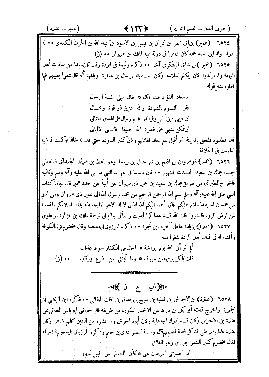 <123> عمير بن أبي شمر بن نمران بن قيس بن الأسود بن عبد الله بن الحارث الكندي له إدراك وله بن اسمه محمد وكان شاعرا في دولة عبد الملك بن مروان عمير بن ضابيء اليشكري آخر ذكره وثيمة في الردة وقال كان سيدا من سادات أهل اليمامة ولما ارتدوا كان يكتم إسلامه وكان صديقا للرجال بن عنفوة وبلغهم انه قال شعرا يعنفهم فيما فعلوه منه قوله يا سعاد الفؤاد بنت أثال طال ليلي لفتنة الرجال فتن القوم بالشهادة والله عزيز ذو قوة ومحال ان ديني دين النبي وفي القوم رجال على الهدى امثالي ان تكن منيتي على فطرة الله حنيفا فانني لا أبالي قال فطلبوه فلحق بالمدينة ثم اقبل مع خالد فقاتلهم وكان كثير السودد حتى قال له خالد لو كنت قرشيا لطمعت في الخلافة عمير ذو مران بن أفلح بن شراحيل بن ربيعة وهو ناعط بن مرثد الهمداني الناعطي جد مجالد بن سعيد المحدث المشهور كان مسلما في عهد النبي صلى الله عليه وسلم وكاتبه فاخرج الطبراني من طريق مجالد بن سعيد بن عمير ذي مران عن أبيه عن جده عمير قال جاءنا كتاب النبي صلى الله عليه وسلم بسم الله الرحمن الرحيم من محمد رسول الله الى عمير ذي مران ومن اسلم من همدان اما بعد سلام عليكم فاني احمد اليكم الله الذي لا اله الا هو اما بعد فأنه بلغنا إسلامكم لما قدمنا من أرض الروم فأبشروا فان الله قد هداكم الحديث وسيأتي بيانه في ترجمة مالك بن فزارة الرهاوي عميرة بزيادة هاء في آخره بن بجرة ذكره المرزباني في معجمه وقال مخضرم نزل الكوفة وأنشد له في قتال أهل الردة شعرا منه الم تر ان الله يوم بزاحة أحال على الكفار سوط عذاب فليت أبا بكر يرى من سيوفنا وما نختلي من أذرع ورقاب العين بعدها النون عنبرة بن الأخرش بن ثعلبة بن صبح بن عدي بن أفلت الطائي ذكره بن الكلبي في الجمهرة واخرج قصته أبو بكر بن دريد من الأخبار المنثورة من طريقه قال حدثني أبو ياسر الطائي عن عنبرة بن الاحرش وكان قد أدرك الجاهلية وكان أبوه احرش ولد عشرة من البنين كلهم شاعر وكان عنبرة عالما بأمر طي فذكر قصة لصنمهم قال وبسببه تنصر عدى بن حاتم وذكره المرزباني في معجم الشعراء فقال مخضرم كثير الشعر جزري وهو القائل إذا ابصرتني اعرضت عني كان الشمس من قبلي تدور §
