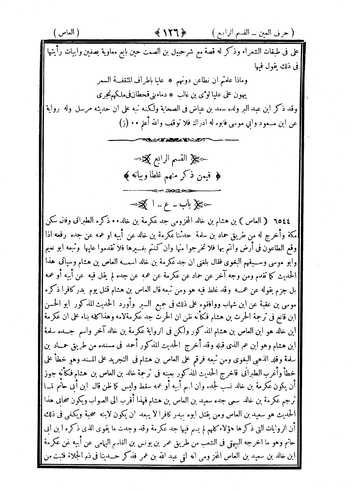 <126> علي في طبقات الشعراء وذكر له قصة مع شرحبيل بن السمط حين تابع معاوية بصفين وأبياتا رأيتها في ذلك يقول فيها وماذا عليهم ان تطاعن دونهم عليا بأطراف المثقفة السمر يهون على عليا لؤي بن غالب دماء بني قحطان في ملكهم تجرى وقد ذكر بن عبد البر ولده سعد بن عياض في الصحابة ولكنه نبه على ان حديثه مرسل وله رواية عن بن مسعود وأبي موسى فأبوه له إدراك فلا توقف والله اعلم القسم الرابع فيمن ذكر منهم غلطا وبيانه العين بعدها الألف العاص بن هشام بن خالد المخزومي جد عكرمة بن خالد ذكره الطبراني وقال سكن مكة واخرج له من طريق حماد بن سلمة حدثنا عكرمة بن خالد عن أبيه أو عمه عن جده رفعه إذا وقع الطاعون في أرض وأنتم بها فلا تخرجوا منها وان كنتم بغيرها فلا تقدموا عليها وتبعه أبو نعيم وأبو موسى وسبقهم البغوي فقال بلغني ان جد عكرمة بن خالد اسمه العاص بن هشام وسيأتي في هذا الحديث كما تقدم من وجه آخر عن حماد عن عكرمة عن عمه عن جده لم يقل فيه عن أبيه أو عمه بل جزم بقوله عن عمه وقد غلط فيه هو ومن تبعه قال العاص بن هشام قتل يوم بدر كافرا ذكره موسى بن عقبة عن بن شهاب ووافقوه على ذلك في جميع السير وأورد الحديث المذكور أبو الحسن بن قانع في ترجمة الحارث بن هشام فكأنه ظن ان الحارث جد عكرمة لأمه وهذا كان بناء على ان عكرمة بن خالد هو بن العاص بن هشام المذكور ولكن في الرواية عكرمة بن خالد آخر واسم جده سلمة بن هشام وهو بن عم الذي قبله وقد أخرج الحديث المذكور أحمد في مسنده من طريق حماد بن سلمة وقلد الذهبي البغوي ومن تبعه فرقم على العاص بن هشام في التجريد علامة المسند وهو خطأ على خطأ وأغرب الطبراني فاخرج الحديث المذكور بعينه في ترجمة خالد بن العاص بن هشام فكأنه جوز ان يكون عكرمة بن خالد نسب لجده وان اسم أبيه أو عمه سقط وليس كما ظن قال بن أبي حاتم لما ترجم عكرمة بن خالد سمى جده سعيد بن العاص بن هشام فهذا أقرب الى الصواب ويكون صحابي هذا الحديث هو سعيد بن العاص ومن يقتل أبوه ببدر كافرا لا يبعد ان يكون لابنه صحبة ويكفي في ذلك ان الروايات التي ذكرها هؤلاء كلهم لم يسم فيها جد عكرمة وقد وجدت ما يقوى الذي ذكره بن أبي حاتم وهو ما أخرجه البيهقي في الشعب من طريق عمر بن يونس بن القاسم اليمامي عن أبيه عن عكرمة بن خالد بن سعيد بن العاص المخزومي انه لقي عبد الله بن عمر فذكر حديثا في ذم الجلاء فثبت من §