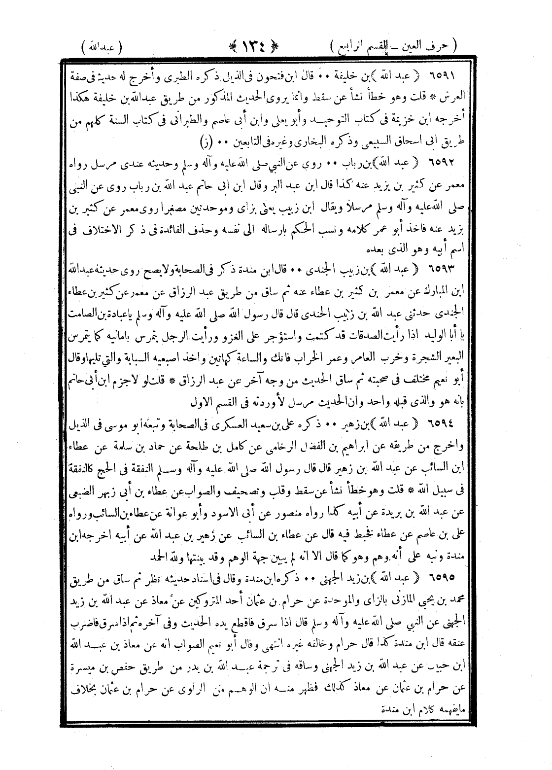 <134> عبد الله بن خليفة قال بن فتحون في الذيل ذكره الطبري واخرج له حديثا في صفة العرش قلت وهو خطأ نشأعن سقط وإنما يروي الحديث المذكور من طريق عبد الله بن خليفة هكذا أخرجه بن خزيمة في كتاب التوحيد وأبو يعلى وابن أبي عاصم والطبراني في كتاب السنة كلهم من طريق أبي إسحاق السبيعي وذكره البخاري وغيره في التابعين عبد الله بن رئاب روى عن النبي صلى الله عليه وسلم وحديثه عندي مرسل رواه معمر عن كثير بن يزيد عنه كذا قال بن عبد البر وقال بن أبي حاتم عبد الله بن رئاب روى عن النبي صلى الله عليه وسلم مرسلا ويقال بن زبيب يعني بزاي وموحدتين مصغرا روى عن كثير بن يزيد عنه فأخذ أبو عمر كلامه ونسب الحكم بارساله الى نفسه وحذف الفائدة في ذكر الاختلاف في اسم أبيه وهو الذي بعده عبد الله بن زبيب الجندي قال بن منده ذكر في الصحابة ولا يصح روى حديثه عبد الله بن المبارك عن معمر بن كثير بن عطاء عنه ثم ساق من طريق عبد الرزاق عن معمر عن كثير بن عطاء الجندي حدثني عبد الله بن زبيب الجندي قال قال رسول الله صلى الله عليه وسلم يا عبادة بن الصامت يا أبا الوليد إذا رأيت الصدقات قد كتمت واستؤجر على الغزو ورأيت الرجل يتمرس بامانته كما يتمرس البعير الشجرة وخرب العامر وعمر الخراب فإنك والساعة كهاتين وأخذ أصبعيه السبابة والتي تليها وقال أبو نعيم مختلف في صحبته ثم ساق الحديث من وجه آخر عن عبد الرزاق قلت لولا جزم بن أبي حاتم بأنه هو والذي قبله واحد وأن الحديث مرسل لأوردته في القسم الأول عبد الله بن زهير ذكره على بن سعيد العسكري في الصحابة وتبعه أبو موسى في الذيل وأخرج من طريقه عن إبراهيم بن الفضل الرخاني عن كامل بن طلحة عن حماد بن سلمة عن عطاء بن السائب عن عبد الله بن زهير قال قال رسول الله صلى الله عليه وسلم النفقة في الحج كالنفقة في سبيل الله قلت وهو خطأ نشأ عن سقط وقلب وتصحيف والصواب عن عطاء بن أبي زهير الضبعي عن عبد الله بن بريدة عن أبيه كذا رواه منصور عن أبي الأسود وأبو عوانة عن عطاء بن السائب ورواه علي بن عاصم عن عطاء فخبط فيه قال عن عطاء بن السائب عن زهير بن عبد الله عن أبيه أخرجه بن منده ونبه على انه وهم وهو كما قال الا انه لم يبين جهة الوهم وقد بينتها ولله الحمد عبد الله بن زيد الجهني ذكره بن منده وقال في إسناد حديثه نظر ثم ساق من طريق محمد بن يحيى المأربي بالراء والموحدة عن حرام بن عثمان أحد المتروكين عن معاذ عن عبد الله بن زيد الجهني عن النبي صلى الله عليه وسلم قال إذا سرق فاقطع يده الحديث وفي آخره ثم إذا سرق فاضرب عنقه قال بن منده كذا قال حرام وخالفه غيره انتهى وقال أبو نعيم الصواب انه عن معاذ بن عبد الله بن حبيب عن عبد الله بن زيد الجهني وساقه في ترجمة عبد الله بن بدر من طريق حفص بن ميسرة عن حرام بن عثمان عن معاذ كذلك فظهر منه ان الوهم من الراوي عن حرام بن عثمان بخلاف ما يفهمه كلام بن منده §