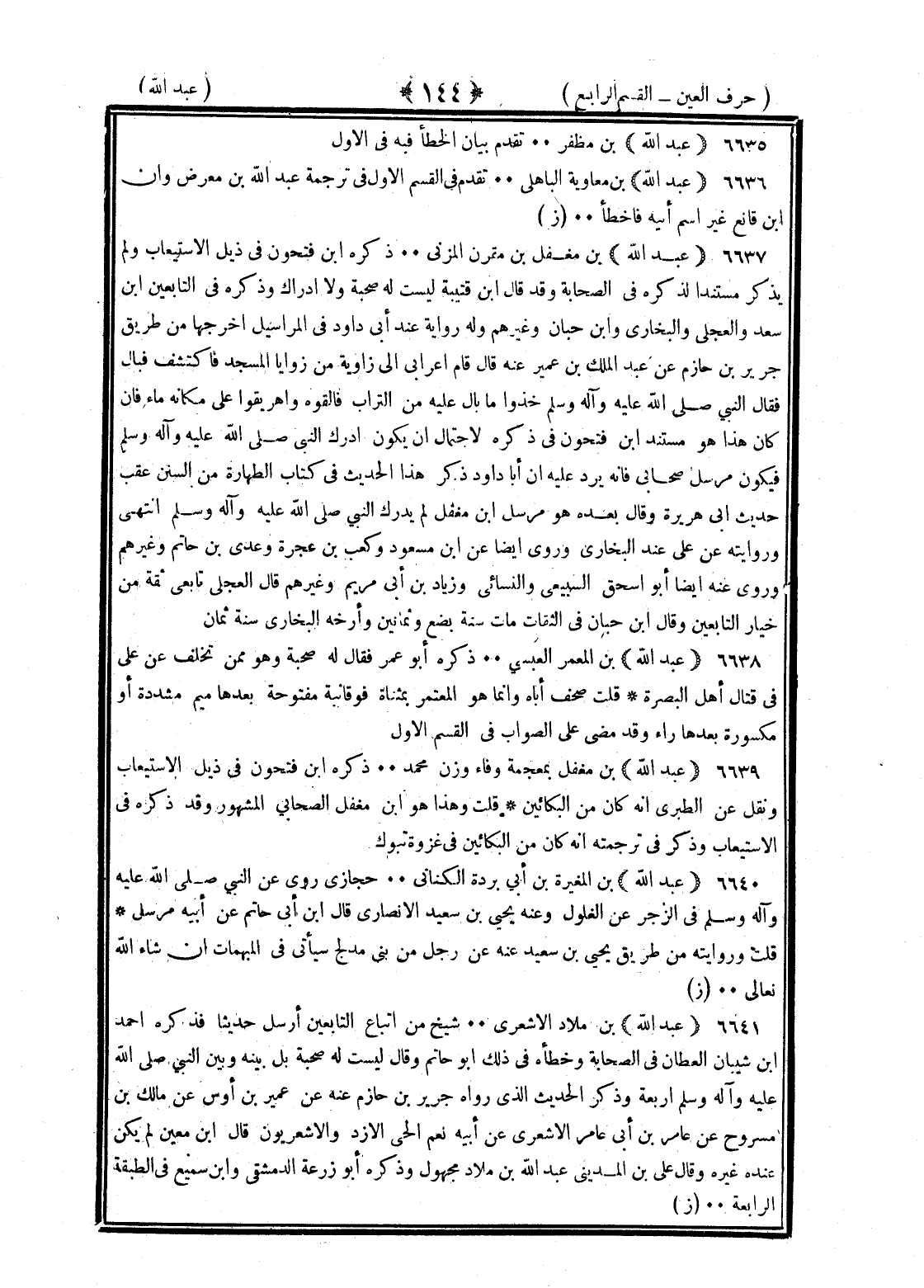 <144> عبد الله بن مظفر تقدم بيان الخطأ فيه في الأول عبد الله بن معاوية الباهلي تقدم في القسم الأول في ترجمة عبد الله بن معرض وان بن قانع غير اسم أبيه فأخطأ عبد الله بن معقل بن مقرن المزني ذكره بن فتحون في ذيل الاستيعاب ولم يذكر مستندا لذكره في الصحابة وقد قال بن قتيبة ليست له صحبة ولا إدراك وذكره في التابعين بن سعد والعجلي والبخاري وابن حبان وغيرهم وله رواية عند أبي داود وفي المراسيل أخرجها من طريق جرير بن حازم عن عبد الملك بن عمير عنه قال قام أعرابي الى زاوية من زوايا المسجد فاكتشف فبال فقال النبي صلى الله عليه وسلم وأله وسلم خذوا ما بال عليه من التراب فألقوه واهريقوا عليه مكانه ماء فان كان هذا هو مستند بن فتحون في ذكره لاحتمال ان يكون أدرك النبي صلى الله عليه وسلم فيكون مرسل صحابي فإنه يرد عليه ان أبا داود ذكر هذا الحديث في كتاب الطهارة من السنن عقب حديث أبي هريرة وقال بعده هو مرسل وابن معقل لم يدرك النبي صلى الله عليه وسلم انتهى وروايته عن علي عند البخاري وروى أيضا عن بن مسعود وكعب بن عجرة وعدى بن حاتم وغيرهم وروى عنه أيضا أبو إسحاق السبيعي والنسائي وزياد بن أبي مريم وغيرهم قال العجلي تابعي ثقة من خيار التابعين وقال بن حبان في الثقات مات سنة بضع وثمانين وأرخه البخاري سنة ثمان عبد الله بن المعمر العبسي ذكره أبو عمر فقال له صحبة وهو ممن تخلف عن علي في قتال أهل البصرة قلت صحف أباه وانما هو المعتمر بمثناة فوقانية مفتوحة بعدها ميم مشددة ومكسورة بعدها راء وقد مضى على الصواب في القسم الأول عبد الله بن مغفل بمعجمة وفاء وزن محمد ذكره بن فتحون في ذيل الاستيعاب ونقل عن الطبري انه كان من البكائين قلت هذا هو بن مغفل الصحابي المشهور وقد ذكره في الاستيعاب وذكر في ترجمته انه كان من البكائين في غزوة تبوك عبد الله بن المغيرة بن أبي بردة الكناني حجازي روى عن النبي صلى الله عليه وسلم في الزجر عن الغلول وعنه يحيى بن سعيد الأنصاري قال بن أبي حاتم عن أبيه مرسل قلت وروايته من طريق يحيى بن سعيد عنه عن رجل من بني مدلج سيأتي في المبهمات ان شاء الله تعالى عبد الله بن ملاذ الأشعري شيخ من اتباع التابعين أرسل حديثا فذكره احمد بن شيبان العطار في الصحابة وخطأه في ذلك أبو حاتم وقال ليست له صحبة بل بينه وبين النبي صلى الله عليه وسلم أربعة وذكر الحديث الذي رواه جرير بن حازم عنه عن نمير بن أوس عن مالك بن مسروح عن عامر بن أبي عامر الأشعري عن أبيه نعم الحي الأزد والاشعريون قال بن معين لم يكن عنده غيره وقال علي بن المديني عبد الله بن ملاذ مجهول وذكره أبو زرعة الدمشقي وابن سميع في الطبقة الرابعة §