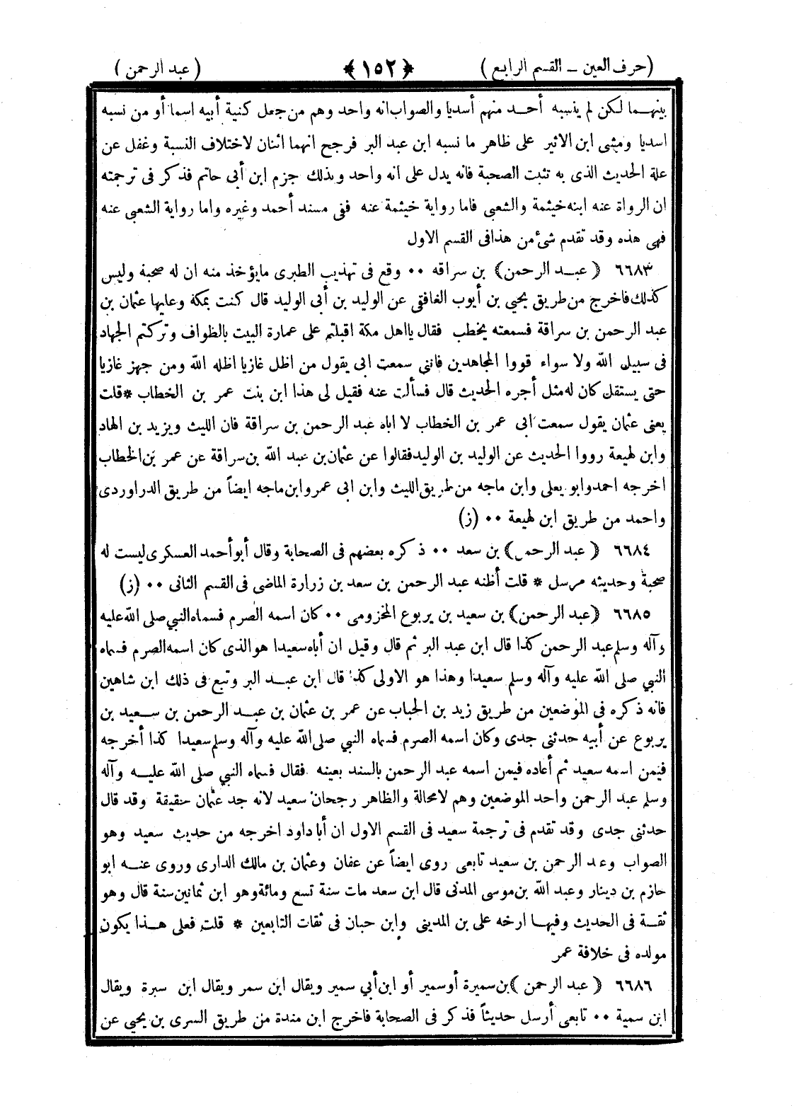 <152> بينهما لكن لم ينسبه أحد منهم اسديا والصواب انه واحد ووهم من جعل كنية أبيه اسما أو من نسبه اسديا ومشى بن الأثير على ظاهر ما نسبه بن عبد البر فرجح انهما اثنان لاختلاف النسبة وغفل عن علة الحديث الذي به تثبت الصحبة فإنه يدل على انه واحد وبذلك جزم بن أبي حاتم فذكر في ترجمته ان الرواة عنه ابنه خيثمة والشعبي فاما رواية خيثمة عنه ففي مسند احمد وغيره واما رواية الشعبي عنه فهي هذه وقد تقدم شيء من هذا في القسم الأول عبد الرحمن بن سراقة وقع في تهذيب الطبري ما يؤخذ منه ان له صحبة وليس كذلك فاخرج من طريق يحيى بن أيوب الغافقي عن الوليد أبي الوليد قال كنت بمكة وعليها عثمان بن عبد الرحمن بن سراقة فسمعته يخطب فقال يأهل مكة اقبلتم على عمارة البيت بالطواف وتركتم الجهاد في سبيل الله ولا سواء قووا المجاهدين فأنني سمعت أبي يقول من أظل غازيا أظله الله ومن جهز غازيا حتى يستقل كان له مثل أجره الحديث قال فسألت عنه فقيل لي هذا بن بنت عمر بن الخطاب قلت يعني عثمان بقوله سمعت أبي عمر بن الخطاب لا أباه عبد الرحمن بن سراقة فان الليث ويزيد بن الهاد وابن لهيعة رووا الحديث عن الوليد بن الوليد فقالوا عن عثمان بن عبد الله بن سراقة عن عمر بن الخطاب أخرجه احمد وأبو يعلى وابن ماجة من طريق الليث وابن أبي عمر وابن ماجة أيضا من طريق الدراوردي وأحمد من طريق بن لهيعة عبد الرحمن بن سعد ذكره بعضهم في الصحابة وقال أبو احمد العسكري ليست له صحبة وحديثه مرسل قلت أظنه عبد الرحمن بن زرارة الماضي في القسم الثاني عبد الرحمن بن سعيد بن يربوع المخزومي كان اسمه الصرم فسماه النبي صلى الله عليه وسلم عبد الرحمن كذا قال بن عبد البر ثم قال وقيل ان أباه سعيدا هو الذي كان اسمه الصرم فسماه النبي صلى الله عليه وسلم سعيدا وهذا هو الأولى كذا قال بن عبد البر وتبع في ذلك بن شاهين فإنه ذكره في الموضعين من طريق زيد بن الحباب عن عمر بن عثمان بن عبد الرحمن بن سعيد بن يربوع عن أبيه حدثني جدي وكان اسمه الصرم فسماه النبي صلى الله عليه وسلم سعيدا كذا أخرجه فيمن اسمه سعيد ثم أعاده فيمن اسمه عبد الرحمن بالسند بعينه فقال فسماه النبي صلى الله عليه وسلم عبد الرحمن هو أحد الموضعين وهم لا محالة والظاهر رجحان سعيد لأنه جد عثمان حقيقة وقد قال حدثني جدي وقد تقدم في ترجمة سعيد في القسم الأول ان أبا داود أخرجه من حديث سعيد وهو الصواب وعبد الرحمن بن سعيد تابعي روى أيضا عن عثمان بن عفان بن مالك الدارمي وروى عنه أبو حازم بن دينار وعبد الله بن موسى المدني قال بن سعد مات سنة تسع ومائة وهو بن ثمانين سنة قال وهو ثقة في الحديث وفيها أرخه على بن المديني وابن حبان في ثقات التابعين قلت فعلى هذا يكون مولده في خلافة عمر عبد الرحمن بن سميرة أو سمير أو بن أبي سمير ويقال بن سمرة ويقال بن سبرة ويقال بن سمية تابعي أرسل حديثا فذكر في الصحابة فاخرج بن منده من طريق السري بن يحيى عن §