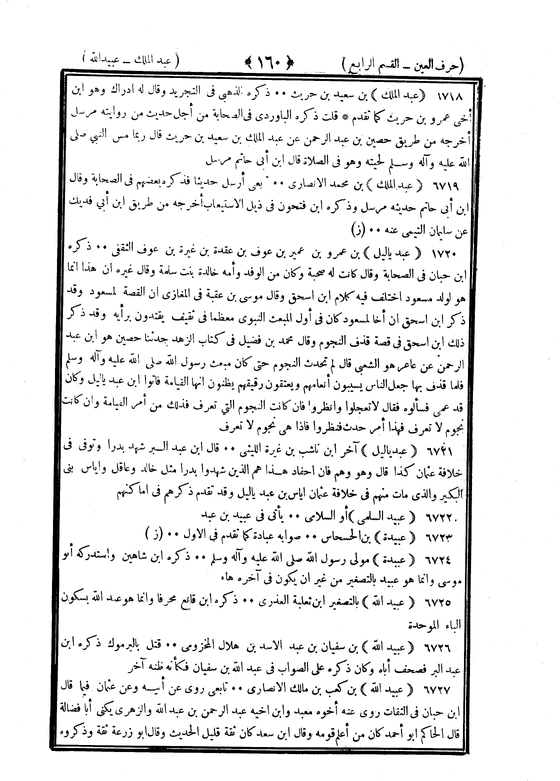 <160> عبد الملك بن سعيد بن حريث ذكره الذهبي في التجريد وقال له إدراك وهو بن أخي عمرو بن حريث كما تقدم قلت ذكره الباوردي في الصحابة من أجل حديث من روايته مرسل أخرجه من طريق حصين بن عبد الرحمن عن عبد الملك بن سعيد بن حريث قال ربما مس النبي صلى الله عليه وسلم لحيته وهو في الصلاة قال بن أبي حاتم هو مرسل عبد الملك بن محمد الأنصاري تابعي أرسل حديثا فذكره بعضهم في الصحابة وقال بن أبي حاتم حديثه مرسل وذكره بن فتحون في ذيل الاستيعاب أخرجه من طريق بن أبي فديك عن سليمان التيمي عنه عبد ياليل بن عمرو بن عمير بن عوف بن عفدة بن غبرة بن عوف الثقفي ذكره بن حبان في الصحابة وقال كانت له صحبة وكان من الوفد وأمه خالدة بنت سلمة وقال غيره إنما هو لولد مسعود اختلف فيه كلام بن إسحاق وقال موسى بن عقبة في المغازي ان القصة لمسعود وقد ذكر بن إسحاق ان أخا لمسعود كان في أول المبعث النبوي معظما في ثقيف يقتدون برأيه وقد ذكر ذلك بن إسحاق في قصة قذف النجوم وقال محمد بن فضيل في كتاب الزهذ حدثنا حصين هو بن عبد الرحمن عن عامر هو الشعبي قال لم يحدث النجوم حتى كان مبعث رسول الله صلى الله عليه وسلم فلما قذف بها جعل الناس يسيبون انعامهم ويعتقون رقيقهم يظنون انها القيامة فاتوا عبد ياليل وكان قد عمي فسألوه فقال لا تعجلوا وانظروا فان كانت النجوم التي تعرف فذلك من أمر القيامة وان كانت نجوم لا تعرف فهذا أمر حدث فنظرووا فإذا هي نجوم لا تعرف عبد ياليل آخر بن ناشب بن غيرة الليثي قال بن عبد البر شهد بدرا وتوفي في خلافة عثمان كذا قال وهو وهم فان احفاد هذا هم الذين شهدوا بدرا مثل خالد وعاقل وإياس بني البكير والذي مات منهم في خلافة عثمان إياس بن عبد ياليل وقد تقدم ذكرهم في اماكنهم عبيد السلمي أو السلامي يأتي في عبد بن عبد عبيدة بن الحسحاس صوابه عبادة كما تقدم في الأول عبيدة مولى رسول الله صلى الله عليه وسلم ذكره بن شاهين واستدركه أبو موسى وانما هو عبيد بالتصغير من غير ان يكون في آخره هاه عبيد الله بالتصغير بن ثعلبة العذري ذكره بن قانع محرفا وانما هو عبد الله بسكون الباء الموحدة عبيد الله بن سفيان بن عبد الأسد بن هلال المخزومي قتل باليرموك ذكره بن عبد البر فصحف أباه وكان ذكره على الصواب في عبد الله بن سفيان فكأنه ظنه آخر عبيد الله بن كعب بن مالك الأنصاري تابعي روى عن أبيه وعن عثمان فيما قال بن حبان في الثقات روى عنه اخوه معبد وابن أخيه عبد الرحمن بن عبد الله والزهري يكنى أبا فضالة قال الحاكم أبو احمد كان من اعلم قومه وقال بن سعد كان ثقة قليل الحديث وقال أبو زرعة ثقة فذكروه §
