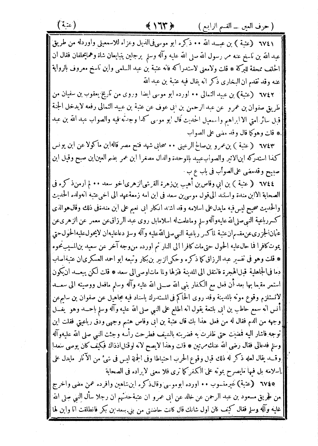 <163> عتبة بن عبد الله ذكره أبو موسى في الذيل وعزاه للإسماعيلي وأورد له من طريق عبد الله بن ناشح عنه مر رسول الله صلى الله عليه وسلم برجلين يتبايعان شاة وهما يحلفان فقال ان الحلف ممحقة للبركة قلت ولا معنى لاستدراكه فإنه عتبة بن عبد السلمي وابن ناشح معروف بالرواية عنه وقد تقدم ان البخاري ذكر انه يقال فيه عتبة بن عبد الله عتبة بن عبيد الثمالي أورده أبو موسى أيضا وروى من تاريخ يعقوب بن سفيان من طريق صفوان بن عمرو عن عبد الرحمن بن أبي عوف عن عتبة بن عبيد الثمالي رفعه لا يدخل الجنة قبل سائر أمتي الا إبراهيم وإسماعيل الحديث قال أبو موسى كذا وجدته فيه والصواب عبد الله بن عبد قلت وهو كما قال وقد مضى على الصواب عتبة بن عمرو بن صالح الرعيني صحابي شهد فتح مصر قاله بن ماكولا عن بن يونس كذا استدركه بن الأثير والصواب عبيد بالموحدة والدال مصغرا بن عمر بضم العين بن صبح وقيل بن صبيح وقد مضى على الصواب في باب العين مع الباء عتبة بن أبي وقاص بن اهيب بن زهرة القرشي الزهري أخو سعد لم ار من ذكره في الصحابة الا بن منده واستند الى قول موسى بن سعد في بن امة زمعة عهد الى أخي عتبة انه ولده الحديث والحديث صحيح لكن ليس فيه ما يدل على إسلامه وقد اشتد إنكار أبي نعيم على بن منده في ذلك وقال هو الذي كسر رباعية النبي صلى الله عليه وسلم وما علمت له اسلاما بل روى عبد الرزاق عن معمر عن الزهري عن عثمان الجزري عن مقسم ان عتبة لما كسر رباعية النبي صلى الله عليه وسلم دعا عليه الا يحول عليه الحول حتى يموت كافرا فما حال عليه الحول حتى مات كافرا الى النار ثم أورده من وجه آخر عن سعيد بن المسيب نحوه قلت وهو في تفسير عبد الرزاق كما ذكره وحكى الزبير بن بكار وتبعه أبو احمد العسكري ان عتبة أصاب دما في الجاهلية قبل الهجرة فانتقل الى المدينة فنزلها ولما مات أوصى الى سعد قلت لكن يبعد ان يكون استمر مقيما بها بعد ان فعل مع الكفار نبي الله صلى الله عليه وسلم ما فعل ووصيته الى سعد لا تلزم وقوع موته بالمدينة وقد روى الحاكم في المستدرك بإسناد فيه مجاهيل عن صفوان بن سليم عن أنس انه سمع حاطب بن أبي بلتعة يقول انه اطلع على النبي صلى الله عليه وسلم بأحد وهو يغسل وجهه من الدم فقال من فعل هذا بك قال عتبة بن أبي وقاص هشم وجهي ودق رباعيتي فقلت أين توجه فأشار اليه فمضيت حتى ظفرت به فضربته بالسيف فطرحت رأسه وجئت النبي صلى الله عليه وسلم فدعا لي فقال رضي الله عنك مرتين قلت وهذا لا يصح لأنه لو قتل إذ ذاك فكيف كان يوصي سعدا وقد يقال لعله ذكر له ذلك قبل وقوع الحرب احتياطا وفي الجملة ليس في شيء من الآثار ما يدل على إسلامه بل فيها ما يصرح بموته على الكفر كما ترى فلا معنى لا يراده في الصحابة عتبة غير منسوب أورده أبو موسى وقال ذكره بن شاهين وافرده عمن مضى واخرج من طريق مسعود بن عبد الرحمن عن خالد عن أبي عمرو ان عتبة حدثهم ان رجلا سأل النبي صلى الله عليه وسلم فقال كيف كان أول شأنك قال كانت حاضنتي من بني سعد بن بكر فانطلقت انا وابن لها §
