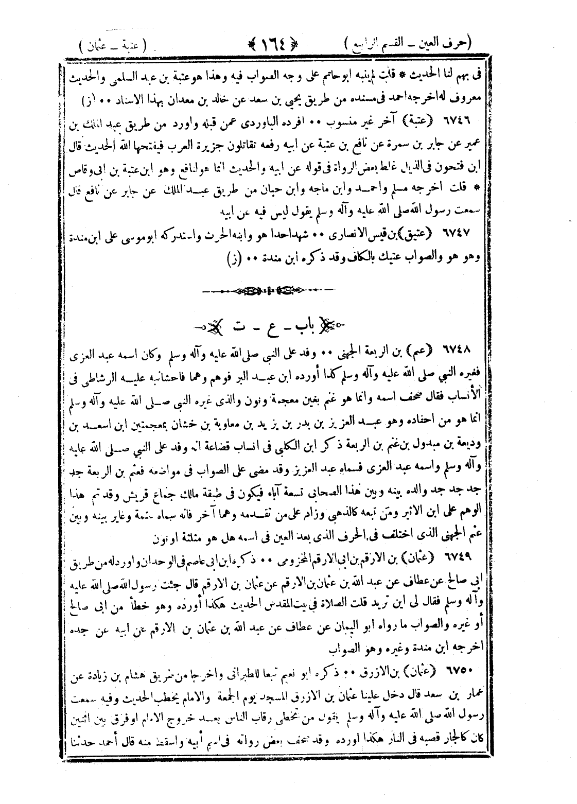 <164> في بهم لنا الحديث قلت لم ينبه أبو حاتم على وجه الصواب فيه وهذا هو عتبة بن عبد السلمي والحديث معروف له أخرجه احمد في مسنده من طريق يحيى بن سعد عن خالد بن معدان بهذا الإسناد عتبة آخر غير منسوب أفرده الباوردي عمن قبله أورده من طريق عبد الملك بن عمير عن جابر بن سمرة عن نافع بن عتبة عن أبيه رفعه تقاتلون جزبرة العرب فيفتحها الله الحديث قال بن فتحون في الذيل غلط بعض الرواة في قوله عن أبيه والحديث إنما هو لنافع وهو بن عتبة بن أبي وقاص قلت أخرجه مسلم وأحمد وابن ماجة وابن حبان من طريق عبد الملك عن جابر عن نافع قال سمعت رسول الله صلى الله عليه وسلم يقول ليس فيه عن أبيه عتيق بن قيس الأنصاري شهد أحدا هو وابنه الحارث واستدركه أبو موسى على بن منده وهو هو والصواب عتيك بالكاف وقد ذكره بن منده العين بعدها الثاء عثم بن الربعة الجهني وفد على النبي صلى الله عليه وسلم وكان اسمه عبد العزي فغيره النبي صلى الله عليه وسلم آله وسلم كذا أورده بن عبد البر فوهم وهما فاحشا نبه عليه الرشاطي في الأنساب فقال صحف اسمه وانما هو غنم بغين معجمة ونون والذي غيره النبي صلى الله عليه وسلم إنما هو من احفاده وهو عبد العزيز بن بدر بن يزيد بن معاوية بن خشان بمعجمتين بن اسعد بن وديعة بن مبذول بن غنم بن الربعه ذكر بن الكلبي في انساب قضاعة انه وفد على النبي صلى الله عليه وسلم واسمه عبد العزي فسماه عبد العزيز وقد مضى على الصواب في مواضعه فعثم بن الربعة جد جد جد جد والده بينه وبين هذا الصحابي تسعة آباء فيكون في طبقة مالك جماع قريش وقد تم هذا الوهم على بن الأثير ومن تبعه كالذهبي وزاد على من تقدمه وهما آخر فإنه سماه عثمة وغاير بينه وبين عثم الجهني الذي اختلف في الحرف الذي بعد العين في اسمه هل هو مثلثة أو نون عثمان بن الأرقم بن أبي الأرقم المخزومي ذكره بن أبي عاصم في الوحدان وأورد له من طريق أبي صالح عن عطاف عن عبد الله بن عثمان بن الأرقم قال جئت رسول الله صلى الله عليه وسلم فقال لي أين تريد قلت الصلاة في بيت المقدس الحديث هكذا أورده وهو خطأ من أبي صالح أو غيره والصواب ما رواه أبو اليمان عن عطاف عن عبد الله بن عثمان بن الأرقم عن أبيه عن جده أخرجه بن منده وغيره وهو الصواب عثمان بن الأزرق ذكره أبو نعيم تبعا للطبراني وأخرجا من طريق هشام بن زياد عن عمار بن سعد قال دخل علينا عثمان بن الأزرق المسجد يوم الجمعة والأمام يخطب الحديث وفيه سمعت رسول الله صلى الله عليه وسلم يقول من تخطى رقاب الناس بعد خروج الامام أو فرق بين اثنين كان كالجار قصبه في النار هكذا أورده وقد صحف بعض رواته في اسم أبيه واسقط منه قال احمد حدثنا §