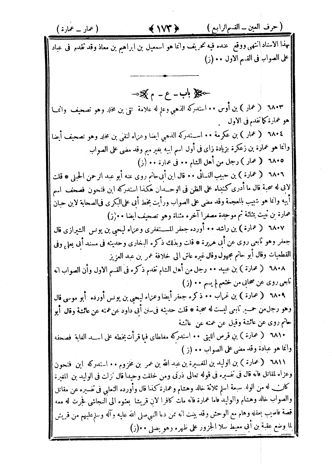 <173> بهذا الإسناد انتهى ووقع عنده فيه تحريف وانما هو إسماعيل بن إبراهيم بن معاذ وقد تقدم في عباد على الصواب في القسم الأول العين بعدها الميم عمار بن أوس استدركه الذهبي وعلم له علامة بقي بن مخلد وهو تصحيف وانما هو عمارة كما تقدم في الأول عمار بن عكرمة استدركه الذهبي أيضا وعزاه لبقي بن مخلد وهو تصحيف أيضا وانما هو عمارة بن زعكرة بزيادة زاي في أول اسم أبيه بغير ميم وقد مضى على الصواب عمار رجل من أهل الشام في عمارة عمارة بن حبيب النسائي قال بن أبي حاتم روى عنه أبو عبد الرحمن الحبلي قلت لأبي له صحبة قال ما أدري كتبناه على الظن في الوحدان هكذا استدركه بن فتحون فصحف اسم أبيه وانما هو شبيب بالمعجمة وقد مضى على الصواب ورأيت بخط أبي علي البكري في الصحابة لابن حبان عمارة بن ثبيت بمثلثة ثم موحدة مصغرا آخره مثناة وهو تصحيف أيضا عمارة بن راشد أورده جعفر المستغفري وعزاه ليحيى بن يونس الشيرازي قال جعفر وهو تابعي روى عن أبي هريرة قلت وبذلك ذكره البخاري وحديثه في مسند أبي يعلى وفي القطعيات وقال أبو حاتم مجهول وقال غيره عاش الى خلافة عمر بن عبد العزيز عمارة بن عبيد رجل من أهل الشام تقدم ذكره في القسم الأول وأن الصواب أنه تابعي روى عن صحابي من خثعم لم يسم عمارة بن غراب ذكره جعفر أيضا وعزاه ليحيى بن يونس أورده أبو موسى قال وهو رجل من حمير تابعي ليست له صحبة قلت حديثه في سنن أبي داود عن عمته عن عائشة وقال أبو حاتم روى عن عائشة وقيل عن عمته عن عائشة عمارة بن قرص الليثي استدركه مغلطاي فيما قرأت بخطه على أسد الغابة فصحفه وانما هو عبادة وقد مضى على الصواب عمارة بن الوليد بن المغيرة بن عبد الله بن عمر بن مخزوم استدركه بن فتحون وعزاه لمقاتل فإنه قال في تفسيره في قوله تعالى ذرني ومن خلقت وحيدا قال نزلت في الوليد بن المغيرة كان له من الولد سبعة اسلم ثلاثة خالد وهشام وعمارة كذا قال وأورده الثعلبي في تفسيره عن مقاتل والصواب خالد وهشام والوليد فاما عمارة فإنه مات كافرا لان قريشا بعثوه الى النجاشي فجرت له معه قصة فاصيب بعقله وهام مع الوحش وقد بينت انه ممن دعا النبي صلى الله عليه وسلم عليهم من قريش لما وضع عقبة بن أبي معيط سلى الجزور على ظهره وهو يصلى §