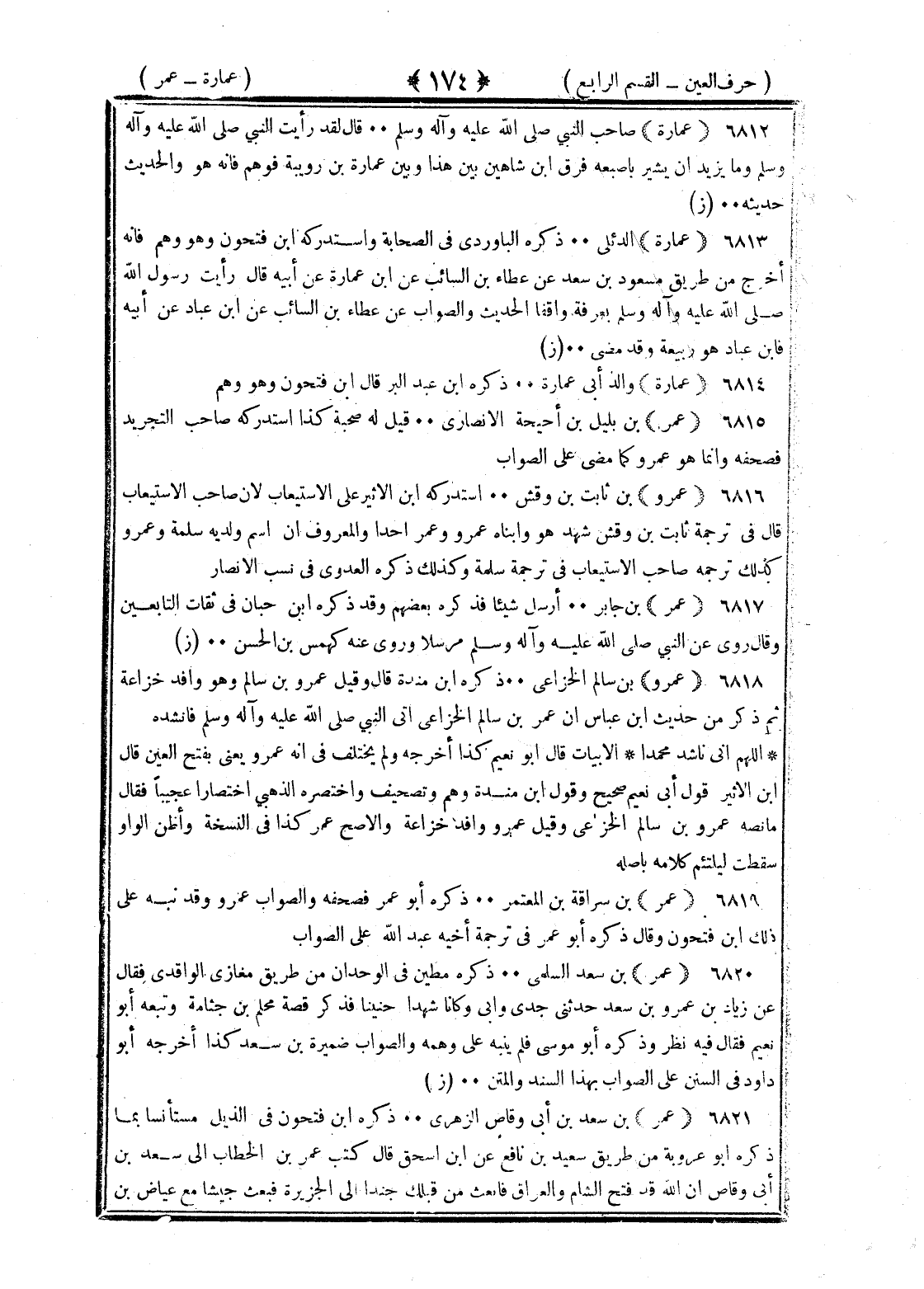 <174> عمارة صاحب النبي صلى الله عليه وسلم قال لقد رأيت النبي صلى الله عليه وسلم وما يريد ان يشير بأصبعه فرق بن شاهين بين هذا وبين عمارة بن رويبة فوهم فأنه هو والحديث حديثه عمارة الدئلي ذكره الباوردي في الصحابة واستدركه بن فتحون وهو وهم فإنه اخرج من طريق مسعود بن سعد عن عطاء بن السائب عن بن عمارة عن أبيه قال رأيت رسول الله صلى الله عليه وسلم بعرفة واقفا الحديث والصواب عن عطاء بن السائب عن بن عباد عن أبيه فابن عباد هو ربيعة وقد مضى عمارة والد أبي عمارة ذكره بن عبد البر قال بن فتحون وهو وهم عمر بن بليل بن أحيحة الأنصاري قيل له صحبة كذا استدركه صاحب التجريد فصحفه وانما هو عمرو كما مضى على الصواب عمر بن ثابت بن وقش استدركه بن الأثير على الاستيعاب لان صاحب الاستيعاب قال في ترجمة ثابت بن وقش شهد هو وابناه عمرو وعمر أحدا والمعروف ان اسم ولديه سلمة وعمر وكذلك ترحمة صاحب الاستيعاب في ترجمة سلمة وكذلك ذكره العدوي في نسب الأنصار عمر بن جابر أرسل شيئا فذكره بعضهم وقد ذكره بن حبان في ثقات التابعين وقال روى عن النبي صلى الله عليه وسلم مرسلا وروى عنه كهمس بن الحسن عمر بن سالم الخزاعي ذكره بن منده قال وقيل عمرو بن سالم وهو وافد خزاعة ثم ذكر من حديث بن عباس ان عمر بن سالم الخزاعي اتى النبي صلى الله عليه وسلم فأنشده اللهم اني ناشد محمدا الأبيات قال أبو نعيم كذا أخرجه ولم يختلف في انه عمرو يعني بفتح العين قال بن الأثير قول أبي نعيم صحيح وقول بن منده وهم وتصحيف واختصره الذهبي اختصارا عجيبا فقال ما نصه عمر بن سالم الخزاعي وقيل عمرو وافد خزاعة والأصح عمر كذا في النسخة وأظن الواو سقطت ليلتئم كلامه بأصله عمر بن سراقة بن المعتمر ذكره أبو عمر فصحفه والصواب عمرو وقد نبه على ذلك بن فتحون وقال ذكره أبو عمر في ترجمة أخيه عبد الله علي الصواب عمر بن سعد السلمي ذكره مطين في الوحدان من طريق مغازي الواقدي فقال عن زياد بن عمر بن سعد حدثني جدي وأبي وكانا شهدا حنينا فذكر قصة محلم بن جثامة وتبعه أبو نعيم فقال فيه نظر وذكره أبو موسى فلم ينبه على وهمه والصواب ضميرة بن سعد كذا أخرجه أبو داود في السنن على الصواب بهذا السند والمتن عمر بن سعد بن أبي وقاص الزهري ذكره بن فتحون في الذيل مستأنسا بما ذكره أبو عروبة من طريق سعيد بن بزيع عن بن إسحاق قال كتب عمر بن الخطاب الى سعد بن أبي وقاص ان الله قد فتح الشام والعراق فابعث من قبلك جندا الى الجزيرة فبعث جيشا مع عياض بن §