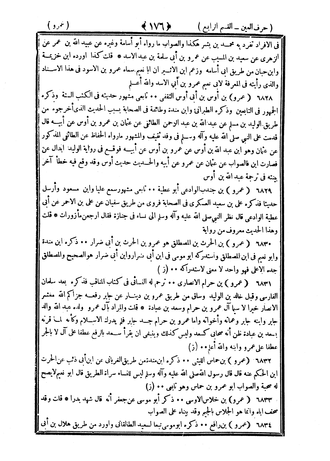 <176> في الإفراد تفرد به محمد بن بشر هكذا والصواب ما رواه أبو أسامة وغيره عن عبيد الله بن عمر عن الزهري عن سعيد بن المسيب عن عمرو بن أبي سلمة بن عبد الأسد قلت كذا أورده بن خزيمة وابن حبان من طريق أبي أسامة وزعم بن الأثير ان أبا نعيم سماه عمرو بن الأسود في هذا الإسناد والذي رأيته في المعرفة لأبي نعيم عمرو بن أبي الأسد والله اعلم عمرو بن أوس بن أبي أوس الثقفي تابعي مشهور حديثه في الكتب الستة وذكره الجمهور في التابعين وذكره الطبراني وابن منده وطائفة في الصحابة بسبب الحديث الذي أخرجوه من طريق الوليد بن مسلم عن عبد الله بن عبد الرحمن الطائفي عن عثمان بن عمرو بن أوس عن أبيه قال قدمت على النبي صلى الله عليه وسلم في وفد ثقيف والمشهور ما رواه الحفاظ عن الطائفي المذكور عن عثمان وهو بن عبد الله بن أوس عن عمرو بن أوس عن أبيه فوقع في رواية الوليد ابدال عن فصارت بن فالصواب عن عثمان عن عمرو عن أبيه والحديث حديث أوس وقد وقع فيه خطأ آخر بينته في ترجمة عبد الله بن أوس عمرو بن جندب الوادعي أبو عطية تابعي مشهور سمع عليا وابن مسعود وأرسل حديثا فذكره علي بن سعيد العسكري في الصحابة فروى من طريق سفيان عن علي بن الأحمر عن أبي عطية الوادعي قال نظر النبي صلى الله عليه وسلم الى نساء في جنازة فقال ارجعن مأزورات قلت وهذا الحديث معروف من رواية عمرو بن الحارث بن المصطلق هو عمرو بن الحارث بن أبي ضرار ذكره بن منده وأبو نعيم في بن المصطلق واستدركه أبو موسى في بن أبي ضرار وابن أبي ضرار هو الصحيح والمصطلق جده الأعلى فهو واحد لامعي لاستدراكه عمرو بن حرام الأنصاري ترجم له النسائي في كتاب المناقب فذكره بعد سلمان الفارسي وقبل خالد بن الوليد وساق من طريق عمرو بن دينار عن جابر رفعه جزاكم الله معشر الأنصار خيرا لا سيما آل عمرو بن حرام وسعد بن عبادة قلت والمراد بآل عمرو ولده عبد الله والد جابر وابنه جابر وعماته واخواته واما عمرو بن حرام جد جابر فلم يدرك الإسلام وكأنه لما قرنه بسعد بن عبادة ظن انه صحابي كسعد وليس كذلك وينبغي ان يقرأ سعد بالرفع عطفا على آل لا بالجر عطفا على عمرو وابنه والله اعلم عمرو بن حماس الليثي ذكره بن منده من طريق الفريابي عن بن أبي ذئب عن الحارث بن الحكم عنه قال قال رسول الله صلى الله عليه وسلم ليس للنساء سراة الطريق قال أبو نعيم لا يصح له صحبة والصواب أبو عمرو بن حماس وهو تابعي عمرو بن خلاس الأوسي ذكر أبو موسى عن جعفر انه قال شهد بدرا قلت وقد صحف أباه وانما هو الجلاس بالجيم وقد بيناه على الصواب عمرو بن رافع ذكره أبو موسى تبعا لسعيد الطالقاني وأورد من طريق هلال بن أبي §