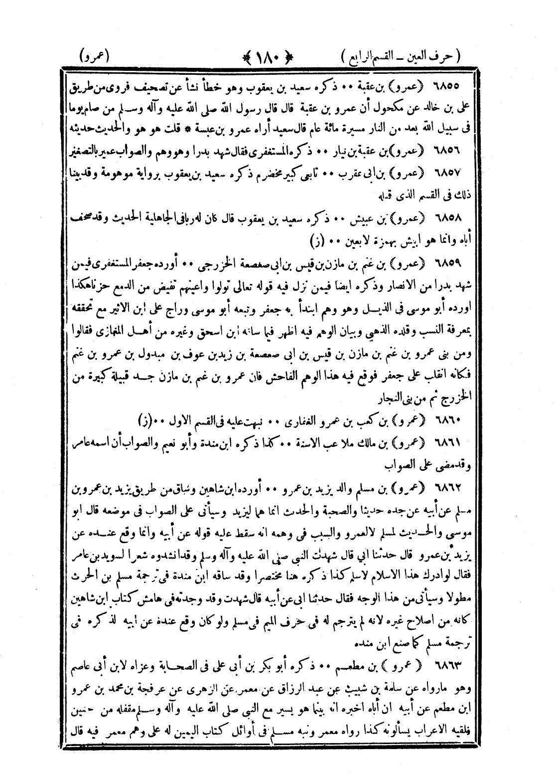 <180> عمرو بن عقبة ذكره سعيد بن يعقوب وهو خطأ نشأ عن تصحيف فروى من طريق علي بن خالد عن مكحول ان عمرو بن عقبة قال قال رسول الله صلى الله عليه وسلم من صام يوما في سبيل الله بعد من النار مسيرة مائة عام قال سعيد أراه عمرو بن عبسة قلت هو هو والحديث حديثه عمرو بن عقبة بن نيار ذكره المستغفري فقال شهد بدرا وهو وهم والصواب عمير بالتصغير عمرو بن أبي عقرب تابعي كبير مخضرم ذكره سعيد بن يعقوب براوية موهومة وقد بينا ذلك في القسم الذي قبله عمرو بن عبيس ذكره سعيد بن يعقوب قال كان له رئي في الجاهلية الحديث وقد صحف أباه وانما هو ابيش بهمزة لا بعين عمرو بن غنم بن مازن بن قيس بن أبي صعصعة الخزرجي أورده جعفر المستغفري فيمن شهد بدرا من الأنصار وذكره أيضا فيمن نزل فيه قوله تعالى تولوا وأعينهم تفيض من الدمع حزنا هكذا أورده أبو موسى في الذيل وهو وهم إبتدأ به جعفر وتبعه أبو موسى وراج على بن الأثير مع تحققه بمعرفة النسب وقلده الذهبي وبيان الوهم فيه أظهر فيما ساقه بن إسحاق وغيره من أهل المغازي فقالوا ومن بني عمرو بن غنم بن مازن قيس بن أبي صعصعة بن زيد بن عوف بن مبذول بن عمرو بن غنم فكأنه انقلب على جعفر فوقع فيه هذا الوهم الفاحش فإنه عمرو بن غنم بن مازن جد قبيلة كبيرة من الخزرج ثم من بني النجار عمرو بن كعب بن عمرو الغفاري نبهت عليه في القسم الأول عمرو بن مالك ملاعب الأسنة كذا ذكره بن منده وأبو نعيم والصواب ان اسمه عامر وقد مضى على الصواب عمرو بن مسلم والد يزيد بن عمرو أورده بن شاهين وساق من طريق يزيد بن عمرو بن مسلم عن أبيه عن جده حديثا والصحبة والحديث إنما هما ليزيد وسيأتي على الصواب في موضعه قال أبو موسى والحديث لمسلم لا لعمرو والسبب في وهمه انه سقط عليه قوله عن أبيه وانما وقع عنده عن يزيد بن عمرو قال حدثنا أبي قال شهدت النبي صلى الله عليه وسلم وقد انشدوه شعرا لسويد بن عامر فقال لو أدرك هذا الإسلام لاسلم كذا ذكره هنا مختصرا وقد ساقه بن منده في ترجمة مسلم بن الحارث مطولا وسيأتي من هذا الوجه فقال حدثني أبي عن أبيه قال شهدت وقد وجدته في هامش كتاب بن شاهين وكأنه من إصلاح غيره لأنه لم يترجم له في حرف الميم في مسلم ولو كان وقع عنده عن أبيه لذكره في ترجمة مسلم كما صنع بن منده عمرو بن مطعم ذكره بن أبي علي في الصحابة وعزاه لابن أبي عاصم وهو ما رواه عن سلمة بن شبيب عن عبد الرزاق عن معمر عن الزهري عن عرفجة بن محمد عن عمرو بن مطعم عن أبيه ان أباه أخبره انه بينما هو يسير مع النبي صلى الله عليه وسلم مقفله من حنين فلقيه الاعراب يسألونه كذا رواه معمر ونبه مسلم في أوائل كتاب اليمين له على وهم معمر فيه قال §
