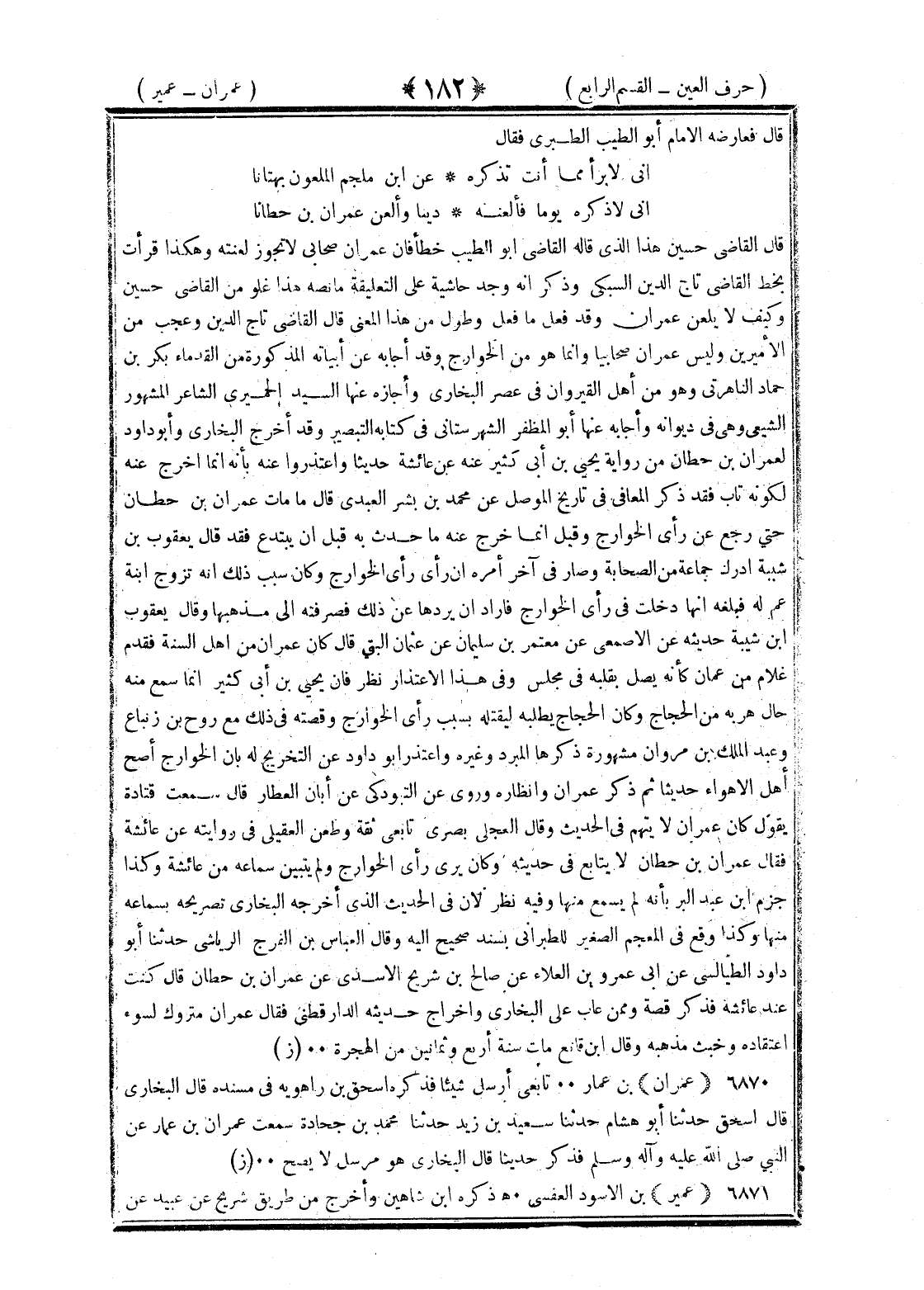 <182> قال فعارضه الامام أبو الطيب الطبري فقال اني لابرأ مما أنت تذكره عن بن ملجم الملعون بهتانا اني لاذكره يوما فألعنه دينا وألعن عمران بن حطانا قال القاضي حسين هذا الذي قاله القاضي أبو الطيب خطأ فان عمران صحابي لا تجوز لعنته وهكذا قرأت بخط القاضي تاج الدين السبكي وذكر انه وجد حاشية على التعليقة ما نصه هذا غلو من القاضي حسين وكيف لا يلعن عمران وقد فعل ما فعل وطول من هذا المعنى قال القاضي تاج الدين وعجب من الأمرين وليس عمران صحابيا وانما هو من الخوارج وقد إجابة عن أبياته المذكورة من القدماء بكر بن حماد التاهرتي وهو من أهل القيروان في عصر البخاري وأجاب عنها السيد الحميري الشاعر المشهور الشيعي وهي في ديوانه واجابه عنها أبو المظفر الشهد ستأتي في كتابه التبصير وقد اخرج البخاري وأبو داود لعمران بن حطان من رواية يحيى بن أبي كثير عنه عن عائشة حديثا واعتذروا عنه بأنه إنما اخرج عنه لكونه تاب فقد ذكر المعافى في تارخ الموصل عن محمد بن بشر العبدي قال ما مات عمران بن حطان حتى رجع عن رأي الخوارج وقيل إنما خرج عنه ما حدث به قبل ان يبتدع فقد قال يعقوب بن شيبة أدرك جماعة من الصحابة وصار في آخر امره ان رأى رأي الخوارج وكان سبب ذلك انه تزوج ابنة عم له فبلغه انها دخلت في رأى الخوارج فأراد ان يردها عن ذلك فصرفته الى مذهبها وقال يعقوب بن شيبة حديثه عن الأصمعي عن معتمر بن سليمان عن عثمان البتي قال كان عمران من أهل السنة فقدم غلام من عمان كأنه يصل بقلبه في مجلس وفي هذا الاعتذار نظر فان يحيى بن أبي كثير إنما سمع منه حال هربه من الحجاج وكان الحجاج يطلبه ليقتله بسبب رأى الخوارج وقصته في ذلك مع روح بن زنباع وعبد الملك بن مروان مشهورة ذكرها المبرد وغيره واعتذر أبو داود عن التخريج له بان الخوارج أصح أهل الأهواء حديثا ثم ذكر عمران وانظاره وروى عن التبوذكي عن أبان العطار قال سمعت قتادة يقول كان عمران لا يتهم في الحديث وقال العجلي بصري تابعي ثقة وطعن العقيلي في روايته عن عائشة فقال عمران بن حطان لا يتابع في حديثه وكان يرى رأى الخوارج ولم يتبين سماعه من عائشة وكذا جزم بن عبد البر بأنه لم يسمع منها وفيه نظر لان في الحديث الذي أخرجه البخاري تصريحه بسماعه منها وكذا وقع في المعجم الصغير للطبراني بسند صحيح اليه وقال العباس بن الفرج الرياشي حدثنا أبو الوليد الطيالسي عن أبي عمرو بن العلاء عن صالح بن شريح الأسدي عن عمران بن حطان قال كنت عند عائشة فذكر قصة وممن عاب على البخاري إخراج حديثه الدارقطني فقال عمران متروك لسوء اعتقاده وخبث مذهبه وقال بن قانع مات سنة أربع وثمانين من الهجرة عمران بن عمار تابعي أرسل شيئا فذكره إسحاق بن راهويه في مسنده قال البخاري قال إسحاق حدثنا أبو هشام حدثنا سعيد بن زيد حدثنا محمد بن جحادة سمعت عمران بن عمار عن النبي صلى الله عليه وسلم فذكر حديثا قال البخاري هو مرسل لا يصح عمير بن الأسود العنسي ذكره بن شاهين واخرج من طريق شريح عن عبيد عن §