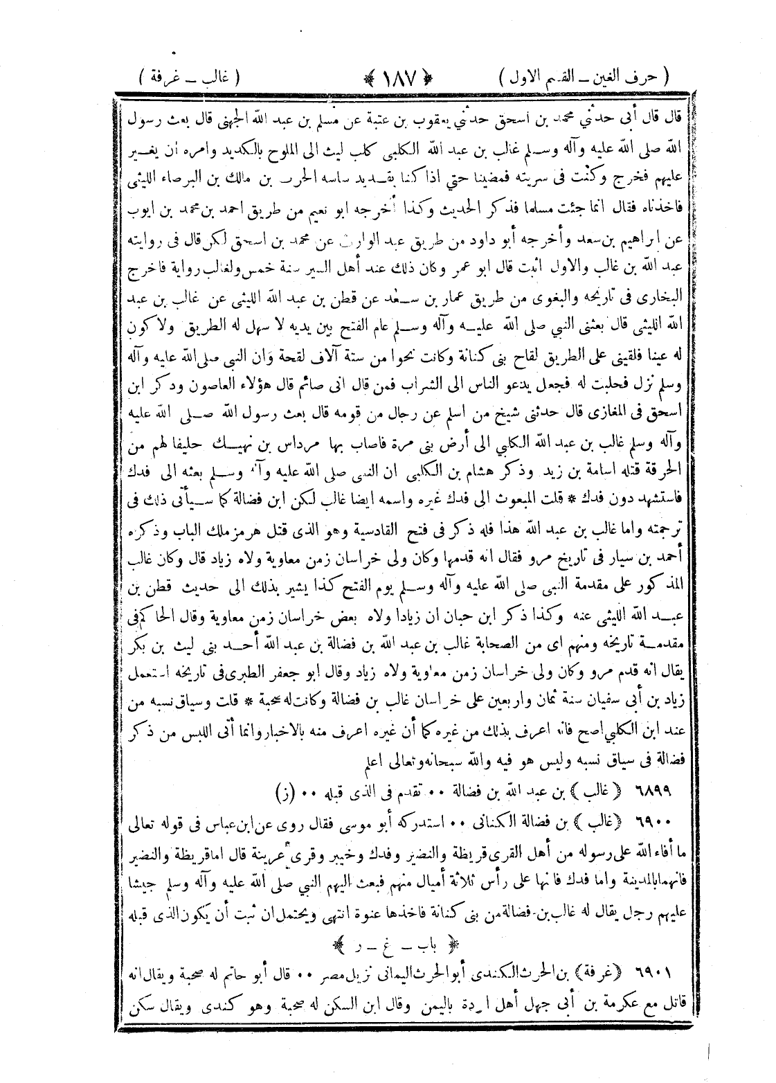 <187> قال قال أبي حدثني محمد بن إسحاق حدثني يعقوب بن عتبة عن مسلم بن عبد الله الجهني قال بعث رسول الله صلى الله عليه وسلم غالب بن عبد الله الكلبي كلب ليث الى الملوح بالكديد وأمره ان يغير عليهم فخرج وكنت في سريته فمضينا حتى إذا كنا يقديد لقينا الحارث بن مالك بن البرصاء الليثي فاخذناه فقال إنما جئت مسلما فذكر الحديث وكذا أخرجه أبو نعيم من طريق احمد بن محمد بن أيوب عن إبراهيم بن سعد وأخرجه أبو داود من طريق عبد الوارث عن محمد بن إسحاق لكن قال في روايته عبد الله بن غالب والأول اثبت قال أبو عمر وكان ذلك عند أهل السير سنة خمس ولغالب رواية فاخرج البخاري في تاريخه والبغوي من طريق عمار بن سعد عن قطن بن عبد الله الليثي عن غالب بن عبد الله الليثي قال بعثني النبي صلى الله عليه وسلم عام الفتح بين يديه لا سهل له الطريق ولاكون له عينا فلقيني على الطريق لقاح بني كنانة وكنت نحوا من ستة آلاف لقحة وان النبي صلى الله عليه وسلم نزل فحلبت له فجعل يدعو الناس الى الشراب فمن قال اني صائم قال هؤلاء العاصون وذكر بن إسحاق في المغازي قال حدثني شيخ من اسلم عن رجال من قومه قال بعث رسول الله صلى الله عليه وسلم غالب بن عبد الله الكلبي الى أرض بي مرة فأصاب بها مرداس بن نهيك حليفا لهم من الحرقة قتله أسامة بن زيد وذكر هشام بن الكلبي ان النبي صلى الله عليه وسلم بعثه الى فدك فاستشهد دون فدك قلت المبعوث الى فدك غيره واسمه أيضا غالب لكن قال بن فضالة كما سيأتي ذلك في ترجمته واما غالب بن عبد الله هذا فله ذكر في فتح القادسية وهو الذي قتل هرمز ملك الباب وذكره احمد بن سيار في تاريخ مرو فقال انه قدمها وكان ولى خراسان زمن معاوية ولاه زياد قال كان غالب المذكور على مقدمة النبي صلى الله عليه وسلم يوم الفتح كأنه يشير بذلك الى حديث قطن بن عبد الله الليثي عنه وكذا ذكر بن حبان ان زيادا ولاه بعض خراسان زمن معاوية وقال الحاكم في مقدمة تاريخه ومنهم أي من الصحابة غالب بن عبد الله بن فضالة بن عبد الله أحد بني ليث بن بكر يقال انه قدم مرو وكان ولى خراسان زمن معاوية ولاه زياد وقال أبو جعفر الطبري في تاريخه استعمل زياد بن أبي سفيان سنة ثمان وأربعين على خراسان غالب بن فضالة وكانت له صحبة قلت وسياق نسبه من عند بن الكلبي أصح فإنه اعرف بذلك من غيره كما ان غيره اعرف منه بالأخبار وانما اتى اللبس من ذكر فضالة في سياق نسبة وليس هو فيه والله سبحانه وتعالى اعلم غالب بن عبد الله بن فضالة تقدم في الذي قبله غالب بن فضالة الكناني استدركه أبو موسى فقال روى عن بن عباس في قوله تعالى ما افاء الله على رسوله من أهل القرى قريظة والنضير وفدك وخيبر وقرى عرينة قال اما قريظة والنضير فإنهما بالمدينة واما فدك فانها على رأس ثلاثة اميال منهم فبعث إليهم النبي صلى الله عليه وسلم جيشا عليهم رجل يقال له غالب بن فضالة من بني كنانة فاخدها عنوة انتهى ويحتمل ان ثبت ان يكون الذي قبله الغين بعدها الراء غرفة بن الحارث الكندي أبو الحارث اليماني نزيل مصر قال أبو حاتم له صحبة ويقال انه قاتل مع عكرمة بن أبي جهل أهل الردة باليمن وقال بن السكن له صحبة وهو كندي ويقال سكن §