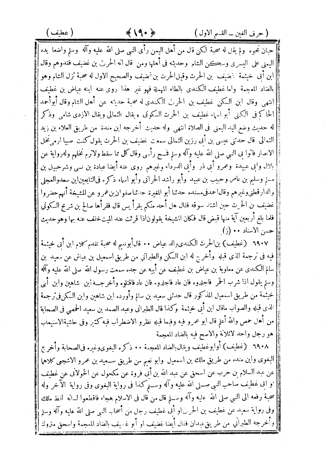 <190> حبان نحوه ولم يقل له صحبة لكن قال من أهل اليمن رأى النبي صلى الله عليه وسلم واضعا يده اليمنى على اليسرى وسكن الشام وحديثه في أهلها ومن قال انه الحارث بن غضيف فقد وهم وقال بن أبي خيثمة غضيف بن الحارث وقيل الحارث بن غضيف والصحيح الأول له صحبة نزل الشام وهو بالضاد المعجمة واما غطيف الكندي بالطاء المهملة فهو غير هذا روى عنه ابنه عياض بن غطيف انتهى وقال بن السكن غطيف بن الحارث الكندي له صحبة حديثه عن أهل الشام وقال أبو احمد الحاكم في الكنى أبو أسماء غطيف بن الحارث السكوني ويقال الثمالي ويقال الأزدي شامي وذكر له حديث وضع اليد اليمنى في الصلاة انتهى وله حديث أخرجه بن منده من طريق العلاء بن زيد الثمالي قال حدثني عيسى بن أبي رزين الثمالي سمعت غضيف بن الحارث يقول كنت صبيا ارمي نخل الأنصار فاتوا بي النبي صلى الله تعالى عليه وعلى آله وسلم فمسح رأسي وقال كل مما سقط ولا ترم نخلهم وله رواية عن بلال وأبي عبيدة وعمر وأبي ذر وأبي الدرداء وغيرهم روى عنه أيضا عبادة بن نسي وشرحبيل بن مسلم وسليم بن عامر وحبيب بن عبيد وأبو راشد الحبراني وأبو أسماء ذكره في التابعين بن سعد والعجلي والدارقطني وغيرهم وقال احمد في مسنده حدثنا أبو المغيرة حدثنا صفوان بن عمرو عن المشيخة انهم حضروا غضيف بن الحارث حبن اشتد سوقه فقال هل أحد منكم يقرأ يس قال فقرأها صالح بن شريح السكوني فلما بلغ أربعين آية منها قبض قال فكان المشيخة يقولون إذا قرئت عند الميت خفف عنه بها وهو حديث حسن الإسناد غطيف بن الحارث الكندي والد عياض قال أبو نعيم له صحبة تقدم كلام بن أبي خيثمة فيه في ترجمة الذي قبله واخرج له بن السكن والطبراني من طريق إسماعيل بن عياش عن سعيد بن سالم الكندي عن معاوية بن عياض بن غطيف عن أبيه عن جده سمعت رسول الله صلى الله عليه وسلم يقول إذا شرب الخمر فاجلدوه فان عاد فاجلدوه فان عاد فاقتلوه وأخرجه بن شاهين وابن أبي خيثمة من طريق إسماعيل المذكور قال حدثني سعيد بن سلم وأورده بن شاهين وابن السكن في ترجمة الذي قبله والصواب ما قال بن أبي خيثمة وكذا قال الطبراني وعبد الصمد بن سعيد الحمصي في الصحابة من أهل حمص والله اعلم وقال أبو عمر وفي الذي قبله نظر والاضطراب فيه كثير وفي حاشية الاستيعاب هو رجل واحد لا ثلاثة والأصح فيه بالضاد المعجمة غطيف أو أبو غطيف ويقال بالضاد المعجمة ذكره البغوي وغيره في الصحابة واخرج البغوي وابن منده من طريق مالك بن إسماعيل وأبو نعيم من طريق سعيد بن عمرو الاشعثي كلاهما عن عبد السلام بن حرب عن إسحاق عن عبد الله بن أبي فروة عن مكحول عن الخولاني عن غطيف أو أبي غطيف صاحب النبي صلى الله عليه وسلم كذا في رواية البغوي وفي رواية الآخر وله صحبة رفعه الى النبي صلى الله عليه وسلم قال من قال في الإسلام هجاء فاقطعوا لسانه لفظ مالك وفي رواية سعيد عن غطيف بن الحارث أو أبي غطيف رجل من أصحاب النبي صلى الله عليه وسلم وأخرجه الطبراني من طريق عبدان فقال أيضا غضيف أو أبو غضيف بالضاد المعجمة وإسحاق متروك والله المستعان الغين بعدها النون §