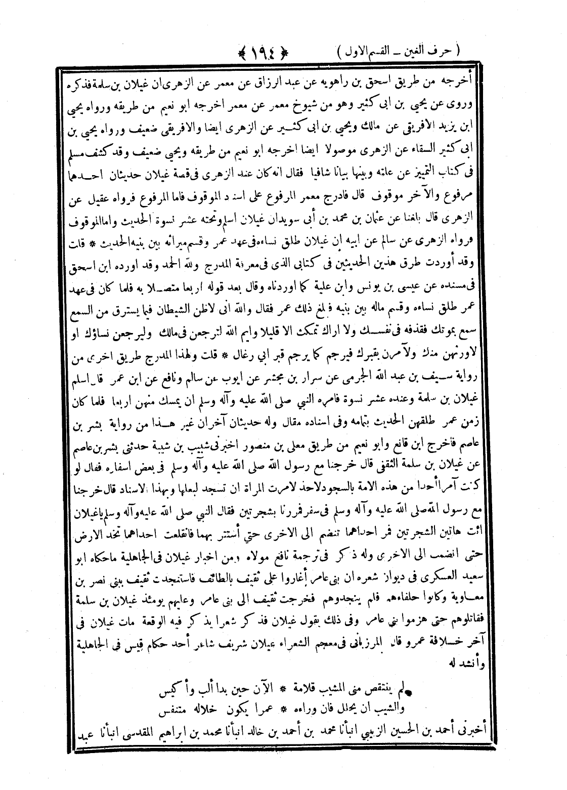 <194> أخرجه من طريق إسحاق بن راهويه عن عبد الرزاق عن معمر عن الزهري ان غيلان بن سلمة فذكره وروى عن يحيى بن أبي كثير وهو من شيوخ معمر عن معمر أخرجه أبو نعيم من طريقه ورواه يحيى بن سلام الإفريقي عن مالك ويحيى بن أبي كثير عن الزهري أيضا والافريقي ضعيف ورواه يحيى بن أبي كثير السقاء عن الزهري موصولا أيضا أخرجه أبو نعيم من طريقه ويحيى ضعيف وقد كشف مسلم في كتاب التمييز عن علته وبينها بيانا شافيا فقال انه كان عند الزهري في قصة غيلان حديثان أحدهما مرفوع والآخر موقوف قال فادرج معمر المرفوع على إسناد الموقوف فاما المرفوع فرواه عقيل عن الزهري قال بلغنا عن عثمان بن محمد بن أبي سويد ان غيلان اسلم وتحته عشر نسوة الحديث واما الموقوف فرواه الزهري عن سالم عن أبيه ان غيلان طلق نساءه في عهد عمر وقسم ميراثه بين بنيه الحديث قلت وقد اوردت طرق هذين الحديثين في كتابي الذي في معرفة المدرج ولله الحمد وقد اورده بن إسحاق في مسنده عن عيسى بن يونس وابن علية كما اوردناه وقال بعد قوله أربعا متصلا به فلما كان في عهد عمر طلق نساءه وقسم ماله بين بنيه فبلغ ذلك عمر فقال والله اني لاظن الشيطان فيما يسترق من السمع سمع بموتك فقذفه في نفسك ولا أراك تمكث الا قليلا وايم الله لترجعن في مالك وليرجعن نساؤك أو لأورثهن منك ولآمرن بقبرك فيرجم كما يرجم قبر أبي رغال قلت ولهذا المدرج طريق أخرى من رواية سيف بن عبد الله الجرمي عن سرار بن مجشر عن أيوب عن سالم ونافع عن بن عمر قال اسلم غيلان بن سلمة وعنده عشر نسوة فأمر النبي صلى الله عليه وسلم ان يمسك منهن أربعا فلما كان زمن عمر طلقهن الحديث بتمامه وفي إسناده مقال وله حديثان آخران غير هذا من رواية بشر بن عاصم فاخرج بن قانع وأبو نعيم من طريق معلى بن منصور أخبرني شبيب بن شيبة حدثني بشر بن عاصم عن غيلان بن سلمة الثقفي قال خرجنا مع رسول الله صلى الله عليه وسلم في بعض أسفاره فقال لو كنت آمرا أحدا من هذه الأمة بالسجود لاحد لأمرت المرأة ان تسجد لبعلها وبهذا الإسناد قال خرجنا مع رسول الله صلى الله عليه وسلم في سفر فمررنا بشجرتين فقال النبي صلى الله عليه وسلم يا غيلان ائت هاتين الشجرتين فمر إحداهما تنضم الى الأخرى حتى استتر بهما فانقلعت إحداهما تخذ الأرض حتى انضمت الى الأخرى وله ذكر في ترجمة نافع مولاه ومن أخبار غيلان في الجاهلية ما حكاه أبو سعيد السكري في ديوان شعره ان بني عامر أغاروا على ثقيف بالطائف فاستنجدت ثقيف ببني نصر بن معاوية وكانوا حلفاءهم فلم ينجدوهم فخرجت ثقيف الى بني عامر وعليهم يومئذ غيلان بن سلمة فقاتلوهم حتى هزموا بني عامر وفي ذلك يقول غيلان فذكر شعرا بذكر فيه الوقعة مات غيلان في آخر خلافة عمر قال المرزباني في معجم الشعراء غيلان شريف شاعر أحد حكام قيس في الجاهلية وأنشد له لم ينتقص مني المشيب قلامة الآن حين بدا الب واكيس والشيب ان يحلل فان وراءه عمرا يكون خلاله متنفس أخبرني احمد بن الحسين الزينبي أنبأنا محمد بن احمد بن خالد أنبأنا محمد بن إبراهيم المقدسي أنبأنا عبد §