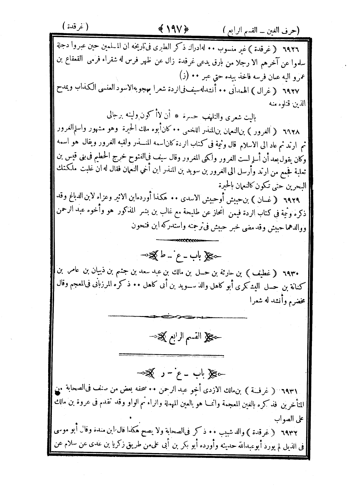 <197> غرقدة غير منسوب له إدراك ذكر الطبري في تاريخه ان المسلمين حين عبروا دجلة سلموا عن آخرهم الا رجلا من بارق يدعى غرقدة زال عن ظهر فرس له شقراء فرمى القعقاع بن عمرو اليه عنان فرسه فأخذ بيده حتى عبره غزال الهمداني انشد له سيف في الردة شعرا يهجو به الأسود العنسي الكذاب ويمدح الذين قتلوه منه يا ليت شعري والتلهف حسرة ان لا اكون وليته برجالي الغرور بن النعمان بن المنذر اللخمي كان أبوه ملك الحيرة وهو مشهور واسلم الغرور ثم ارتد ثم عاد الى الإسلام قال وثيمة في كتاب الردة كان اسمه المنذر ولقبه الغرور ويقال هو اسمه وكان يقول بعد ان اسلم لست الغرور ولكني المغرور وقال سيف في الفتوح خرج الحطيم في بني قيس بن ثعلبة فجمع من ارتد وأرسل الى الغرور بن سويد بن المنذر بن أخي النعمان فقال له ان غلبت ملكتك البحرين حتى تكون كالنعمان بالحيرة الغين بعدها السين غسان بن حبيش أو حبش الأسدي هكذا أورده بن الأثير وعزاه لابن الدباغ وقد ذكره وثيمة في كتاب الردة فيمن انحاز عن طليحة مع غالب بن بشر المذكور هو وأخوه عبد الرحمن ووالدهما حبش وقد مضى خبر جبيش في ترجمته واستدركه بن فتحون الغين بعدها الطاء غطيف بن حارثة بن حسل بن مالك بن عبد سعد بن جشم بن ذبيان بن عامر بن كنانة بن حسل اليشكري أبو كاهل والد سويد بن أبي كاهل ذكره المرزباني في المعجم وقال مخضرم وأنشد له شعرا القسم الرابع الغين بعدها الراء غرفة بن مالك الأزدي أخو عبد الرحمن صحفه بعض من صنف في الصحابة من المتأخرين فذكره بالغين المعجمة وانما هو بالغين المهملة والراء ثم الواو وقد تقدم في عروة بن مالك على الصواب غرقدة والد شبيب ذكر في الصحابة ولا يصح هكذا قال بن منده وقال أبو موسى في الذيل لم يورد أبو عبد الله حديثه وأورده أبو بكر بن أبي علي من طريق زكريا بن عدي عن سلام عن §