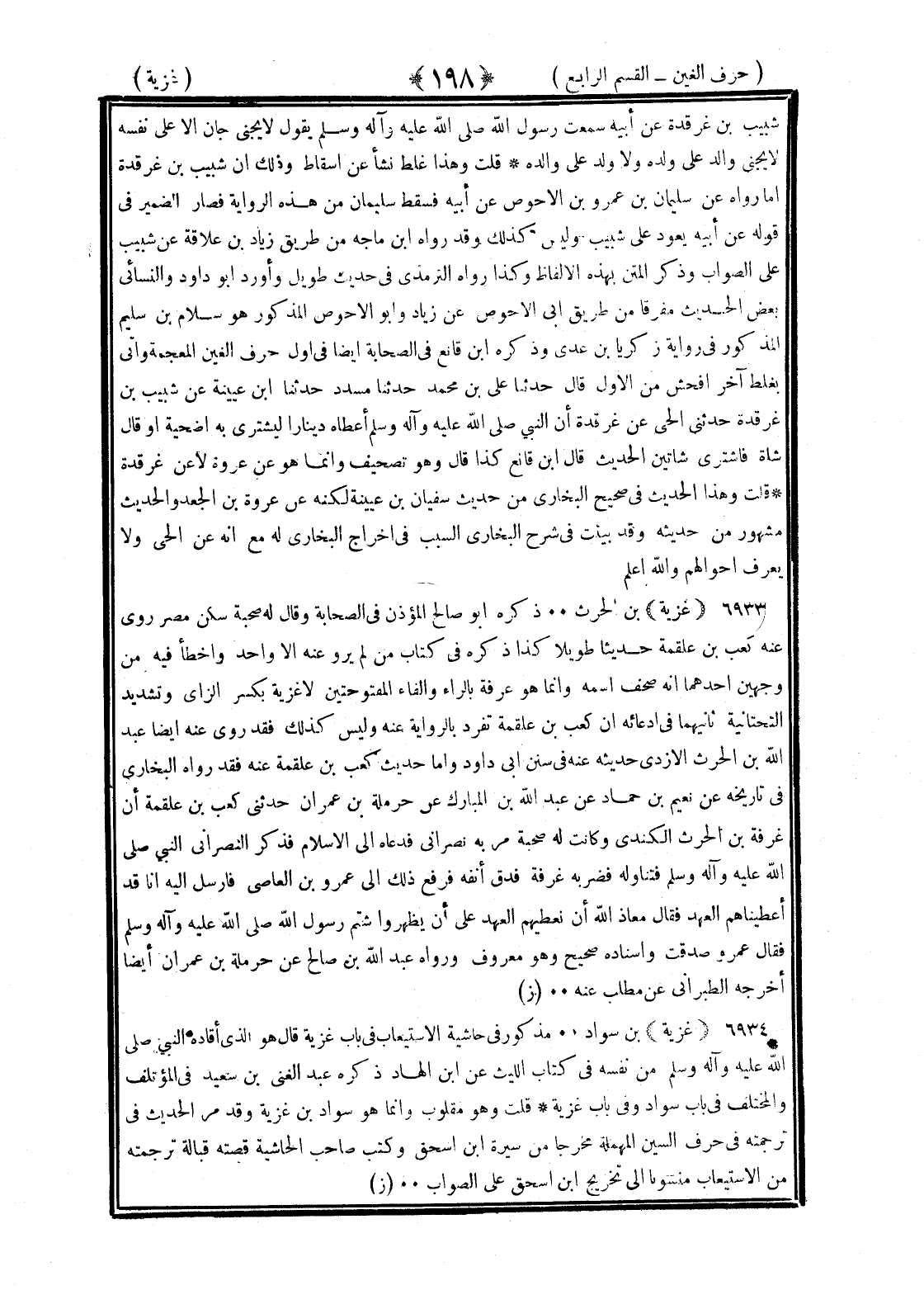 <198> شبيب بن غرقدة عن أبيه سمعت رسول الله صلى الله عليه وسلم يقول لا يجبى جان الا على نفسه لا يجني والد على ولده ولا ولد على والده قلت وهذا غلط نشأ عن إسقاط وذلك ان شبيب بن غرقدة اما رواه عن سليمان بن عمرو بن الأحوص عن أبيه فسقط سليمان من هذه الرواية فصار الضمير في قوله عن أبيه يعود على شبيب وليس كذلك وقد رواه بن ماجة من طريق زياد بن علاقة عن شبيب على الصواب وذكر المتن بهذه الألفاظ وكذا رواه الترمذي في حديث طويل وأورد أبو داود والنسائي بعض الحديث مفرقا من طريق أبي الأحوص عن زياد وأبو الأحوص المذكور هو سلام بن سليم المذكور في رواية زكريا بن عدي وذكره بن قانع في الصحابة أيضا في أول حرف الغين المعجمة واتى بغلط آخر افحش من الأول قال حدثنا علي بن محمد حدثنا مسدد حدثنا بن عيينة عن شبيب بن غرقدة ان النبي صلى الله عليه وسلم أعطاه دينارا ليشتري به أضحية أو قال شاة فاشترى شاتين الحديث قال بن قانع كذا قال وهو تصحيف وانما هو عن عروة لا عن غرقدة قلت وهذا الحديث في صحيح البخاري من حديث سفيان بن عيينة لكنه عن عروة بن الجعد والحديث مشهور من حديثه وقد بينت في شرح البحاري اسبب في إخراج البخاري له مع انه عن الحي ولا يعرف أحوالهم والله اعلم الغين بعدها الزاي غزية بن الحارث ذكره أبو صالح المؤذن في الصحابة وقال له صحبة سكن مصر روى عنه كعب بن علقمة حديثا طويلا كذا ذكره في كتاب من لم يرو عنه الا واحد وأخطأ فيه من وجهين أحدهما انه صحف اسمه وانما هو عرفة بالراء والفاء المفتوحتين لا غزية بكسر الزاي وتشديد التحتانية ثانيهما في ادعائه ان كعب بن علقمة تفرد بالرواية عنه وليس كذلك فقد روى عنه أيضا عبد الله بن الحارث الأزدي حديثه عنه في سنن أبي داود واما حديث كعب بن علقمة عنه فقد رواه البخاري في تاريخه عن نعيم بن حماد عن عبد الله بن المبارك عن حرملة بن عمران حدثني كعب بن علقمة ان عرفة بن الحارث الكندي وكانت له صحبة مر به نصراني فدعاه الى الإسلام فذكر النصراني النبي صلى الله عليه وسلم فتناوله فضربه عرفة فدق انفه فرفع ذلك الى عمرو بن العاص فأرسل اليه إنا قد أعطيناهم العهد فقال معاذ الله ان نعطيهم العهد على ان يظهروا شتم رسول الله صلى الله عليه وسلم فقال عمرو صدقت وإسناده صحيح وهو معروف رواه عبد الله بن صالح عن حرملة بن عمران أيضا أخرجه الطبراني عن مطلب عنه غزية بن سواد مذكور في حاشية الاستيعاب في باب غزية قال هو الذي اقاده النبي صلى الله عليه وسلم من نفسه في كتاب الليث عن بن الهاد ذكره عبد الغني بن سعيد في المؤتلف في باب سواد وفي باب غزية قلت وهو مقلوب وانما هو سواد بن غزية وقد مر الحديث في ترجمته في حرف السين المهملة مخرجا من سيرة بن إسحاق وكتب صاحب الحاشية قصته قبالة ترجمته من الاستيعاب منسوبا الى تخريج بن إسحاق على الصواب الغين بعدها الشين §