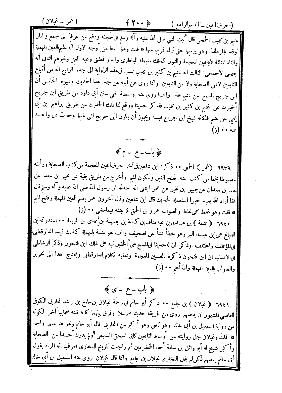 <200> غنيم بن كليب الجمحي ذكره خلف بن القاسم شيخ بن عبد البر واستدركه علي أبي علي بن السكن وكتب بخطه حاشية على كتابه قال أنبأنا أبو الطاهر محمد بن احمد بمكة حدثنا أبي حدثنا المفضل بن محمد الجندي حدثنا ثابت بن معاذ حدثنا عبد المجيد قال ذكر بن جريج عن أبي دعثم واسمه غثيم بن كليب الجمحي قال أتيت النبي صلى الله عليه وسلم في حجته ودفع من عرفة الى جمع والنار توقد بالمزدلفة وهو يرميها حتى نزل قريبا منها قلت وهو غلط من أوجه الأول انه عثيم بالعين المهملة والثاء المثلثة لا بالغين المعجمة والنون كذلك ضبطه البخاري والدارقطني وعبد الغني وغيرهم الثاني انه جهمي لا جمحي الثالث انه غنيم بن كثير بن كليب نسب في هذه الرواية الى جده الرابع انه من اتباع التابعين لا من الصحابة ولا من التابعين وانما روى عن أبيه عن جده هذا الحديث وغيره الخامس ان بن جريج ما سمع من غنيم هذا وانما روى عنه بواسطة ففي سنن أبي داود من طريق بن جريج أخبرت عن غنيم بن كثير بن كليب فذكر حديثا ووقع لنا ذلك الحديث من طريق إبراهيم بن أبي يحيى عن غنيم فكأنه شيخ بن جريج فيه ويجوز ان يكون بن جريج لقي غنيما وحدث عن واحد عنه الغين بعدها الميم غمر الجمحي ذكره بن شاهين في آخر حرف الغين المعجمة من كتاب الصحابة ورأيته مضبوطا بخط من كتب عنه بفتح الغين وسكون الميم واخرج من طريق بقية عن بحير بن سعد عن خالد بت سعدان عن جبير بن نفير عن عمرو الجمحي انه حدثه ان رسول الله صلى الله عليه وسلم قال إذا أراد الله بعبد خيرا استعمله الحديث قال بن شاهين وقال آخرون عمر بضم العين المهملة وفتح الميم قلت وهو غلط على غلط والصواب عمرو بن الحمق كما بينته فيما مضى غنمة بن عدي بن عبد مناف بن كنانة بن جهمة بن عدي بن الربعة استدركه بن الدباغ على بن عبد البر وهو خطأ نشأ عن تصحيف وانما هو عنمة بالمهملة كذلك قيده الدارقطني في المؤتلف والمختلف وذكر ان له حديثا في في المسح على الخفين نبه على ذلك بن فتحون وذكر الرشاطي في الأنساب ان بن فتحون ذكره بالغين المعجمة وتعقبه بكلام الدارقطني ويحتاج هذا الى تحرير والصواب بالعين المهملة والله اعلم الغين بعدها الياء غيلان بن جامع ذكر أبو حاتم في ترجمة غيلان بن جامع بن راشد المحاربي الكوفي القاضي المشهور ان بعضهم روى من طريقه حديثا مرسلا وفرق بينهما كأنه ظنه صحابيا آخر لكونه من رواية إسماعيل بن أبي خالد وهو تابعي وهو أكبر من المحاربي قال أبو حاتم وهو عندي واحد قلت وغيلان جل روايته عن اوساط التابعين كأبي إسحاق السبيعي ولم يدرك أحدا من الصحابة واكبر شيخ له أبو وائل بن سلمة أحد المخضرمين ثم راجعت تاريخ البخاري فعرفت انه المراد بقول أبي حاتم بعضهم لكن لم يقل البخاري غيلان بن جامع وانما قال غيلان روى عنه إسماعيل بن أبي خالد §