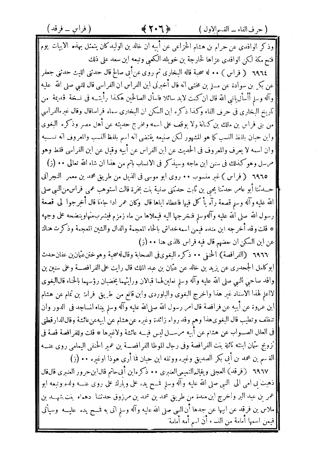 <206> وذكر الواقدي عن حزام بن هشام الخزاعي عن أبيه ان خالد بن الوليد كان يتمثل بهذه الأبيات يوم فتح مكة لكن الواقدي عزاها لخارجة بن خويلد الكعبي وتبعه بن سعد على ذلك فراس له صحبة قاله البخاري ثم روى عن أبي صالح قال حدثني الليث حدثني جعفر عن بكر بن سوادة عن مسلم بن مخشي انه قال أخبرني بن الفراس ان الفراسي قال للنبي صلى الله عليه وسلم أأسأل يا نبي الله قال ان كنت لا بد سائلا فاسأل الصالحين هكذا رأيته في نسخة قديمة من تاريخ البخاري في حرف الفاء وكذا ذكر بن السكن ان البخاري سماه فراسا قال وقال غيره الفراسي من بني فراس بن مالك بن كنانة ولا يوقف على اسمه ومخرج حديثه عن أهل مصر وذكره البغوي وابن حبان بلفظ النسب كما هو المشهور لكن صنيعه يقتضي انه اسم بلفط النسب والمعروف انه نسبه وان اسمه لا يعرف والمعروف في الحديث عن بن الفراسي عن أبيه وقيل عن بن الفراسي فقط وهو مرسل وهو كذلك في سنن بن ماجة وستذكر في الأنساب بأتم من هذا ان شاء الله تعالى فراس غير منسوب روى أبو موسى في الذيل من طريق محمد بن معمر النجراني حدثنا أبو عامر حدثنا يحيى بن ثابت حدثتني صفية بنت بحرة قالت استوهب عمي فراس من النبي صلى الله عليه وسلم قصعة رآه يأكل فيها فأعطاه إياها قال وكان عمر إذا جاءنا قال اخرجوا الى قصعة رسول الله صلى الله عليه وسلم فنخرجها اليه فيملأها من ماء زمزم فيشرب منها وينضحه على وجهه قلت وقد أخرجه بن منده فيمن اسمه خداش بالخاء المعجمة والدال والشين المعجمة وذكرت هناك عن بن السكن ان بعضهم قال فيه فراس كالذي هنا الفرافصة الحنفي ذكره البغوي في الصحابة وقال له صحبة وهو ختن عثمان بن عفان حدث أبو كامل الجحدري عن يزيد بن أبي خالد عن عثمان بن عبد الملك قال رأيت على الفرافصة وعلى سنين بن واقد صاحبي النبي صلى الله عليه وسلم نعلين لهما قبالان ورأيتهما يخضبان رؤوسهما بالحناء قال البغوي لا اعلم لهذا الإسناد غير هذا واخرج البغوي والباوردي وابن قانع من طريق فرات بن تمام عن هشام بن عروة عن أبيه عن فرافصة قال أمر رسول الله صلى الله عليه وسلم ببناء المساجد في الدور وان تنظف وتطيب قال البغوي هذا وهم وقد رواه زائدة وغيره عن هشام عن أبيه عن عائشة وقال الدارقطني في العلل الصواب عن هشام عن أبيه مرسل ليس فيه عائشة ولا غيرها قلت وللفرافصة قصة في تزويج عثمان ابنته نائلة بنت الفرافصة بن عمير الحنفي اليمامي روى عنه القاسم بن محمد بن أبي بكر الصديق وغيره ووثقه بن حبان فما أدري هو ذا أو غيره فرقد العجلي ويقال التميمي العنبري ذكره بن أبي حاتم قال بن جرو العنبري قال قال ذهبت بي أمي الى النبي صلى الله عليه وسلم فمسح يده على وبارك على روى عنه ولده وتبعه أبو عمر بن عبد البر واخرج بن منده من طريق محمد بن محمد بن مرزوق حدثتنا دهمان بنت شهد بنت ملاس بن فرقد عن أبيها عن جدها ان النبي صلى الله عليه وسلم اتى به فمسح يده عليه وسيأتي فيمن اسمها امامة من النساء ان اسم أمه امامة §