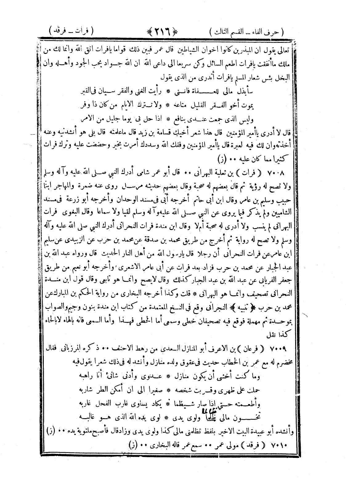 <216> تعالى يقول ان المبذرين كانوا إخوان الشياطين قال عمر فبين ذلك قواما يا فرات اتق الله وانما لك من مالك ما أنفقت يا فرات اطعم السائل وكن سريعا الى داعي الله ان الله جواد يحيب الجود واهله وان البخل بئس شعار المسلم يا فرات أتدري من الذي يقول سأبذل مالي للعفاة فانني رأيت الغنى والفقر سيان في القبر يموت أخو الفقر القليل متاعه ولا تترك الأيام من كان ذاو فر وليس الذي جمعت عندي بنافع إذا حل بي يوما جليل من الأمر قال لا أدري يا أمير المؤمنين قال هذا شعر أخيك قسامة بن زيد قال ما علمته قال بل هو انشدنيه وعنه أخذته وان لك فيه لعبرة قال يا أمير المؤمنين وفقك الله وسددك أمرت بخير وحضضت عليه وترك فرآت كثيرا مما كان عليه فرات بن ثعلبة البهراني قال بن عمر شامي أدرك النبي صلى الله عليه وسلم ولا تصح له رؤية ثم قال قال بعضهم له صحبة وقال بعضهم حديثه مرسل روى عنه ضمرة والمهاجر ابنا حبيب وسليم بن عامر وقال بن أبي حاتم أخرجه أبي في مسند الوحدان وأخرجه أبو زرعة في مسند الشاميين ولم يذكر فيما يروي عن النبي صلى الله عليه وسلم لقيا ولا سماعا وقال البغوي فرأت البهراني لم ينسب ولا أدري له صحبة أم لا وقال بن منده فرات النجراني أدرك النبي صلى الله عليه وسلم ولا تصح له رواية ثم اخرج من طريق محمد بن صدقة عن محمد بن حرب عن الزبيدي عن سليم بن عامر عن فرات النجراني ان رجلا قال يا رسول الله من أهل النار الحديث قال ورواه عبد لله بن عبد الجبار عن محمد بن حرب فزاد بعد فرات عن أبي عامر الأشعري أخرجه أبو نعيم من طريق جعفر الفريابي عن عبد الله بن عبد الجبار كذلك وقال لا يصح وانما هو تاعبي وقال قول بن منده النجراني تصحيف وانما هو البهراني قلت وكذا أخرجه البخاري من رواية الحاكم بن المبارك عن محمد بن حرب تنبيه النجراني وقع في النسخ المعتمدة من كتاب بن منده بنون وجيم والصواب بموحدة ثم مهملة فوقع فيه تصحيفان خطى وسمعى اما الخطى فهذا واما السمعى فإنه بالهاء لا بالحاء كذا نقل فرعان بن الأعرف أبو المنازل السعدي من رهط الأحنف ذكره المرزباني فقال مخضرم له مع عمر بن الخطاب حديث في عقوق ولده منازل وأنشد له في ذلك شعرا يقول فيه وما كنت أخشى ان يكون منازل عدوى وادنى شانيء انا راهبه حملت على ظهري وقربت شخصه صغيرا الى ان أمكن الطر شاربه واطعمته حتى إذا صار شيظما يكاد يساوي غارب الفحل غاربه تخون مالي ظالما ولوى يدي لوى يده الله الذي هو غالبه وأنشد أبو عبيدة البيت الأخير بلفظ تظلمني مالي كذا ولوي يدي وزاد قال فأصبح ملتوية يده فرقد مولى عمر سمع عمر قاله البخاري §