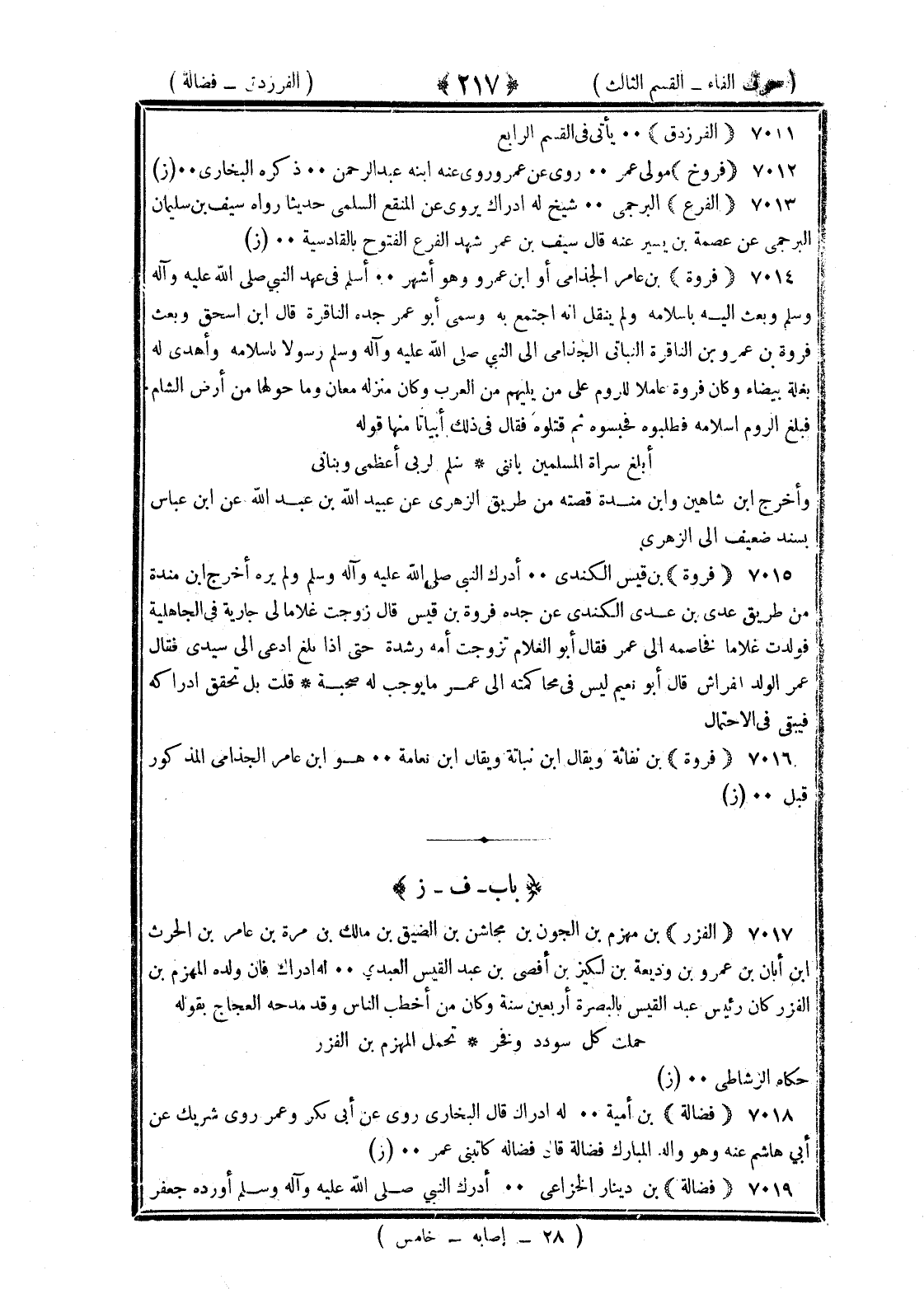 <217> الفرزدق يأتي في القسم الرابع فروخ مولى عمر روى عن عمر وروى عنه ابنه عبد الرحمن ذكره البخاري الفزع البرجمي شيخ له إدراك يروي عن المقنع السلمي حديثا رواه سيف بن سليمان البرجمي عن عصمة بن يسير عنه قال سيف بن عمر شهد الفزع الفتوح بالقادسية فروة بن عامر الجذامي أو بن عمرو وهو اشهر اسلم في عهد النبي صلى الله عليه وسلم وبعث اليه بإسلامه ولم ينقل انه اجتمع به وسمى أبو عمر جده الناقدة قال بن إسحاق وبعث فروة بن عمرو بن الناقدة البناني الجذامي الى النبي صلى الله عليه وسلم رسولا بإسلامه واهدى له بغلة بيضاء وكان فروة عاملا للروم على من يليهم من العرب وكان منزله معان وما حولها من من أرض الشام فبلغ الروم إسلامه فطلبوه فحبسوه ثم قتلوه فقال في ذلك أبياتا منها قوله ابلغ سراة المسلمين بأنني سلم لربي أعظمي وبناني وأخرج بن شاهين وابن منده قصته من طريق الزهري عن عبيد الله بن عبد الله عن بن عباس بسند ضعيف الى الزهري فروة بن قيس الكندي أدرك النبي صلى الله عليه وسلم ولم يره أخرج بن منده من طريق عدي بن عدي الكندي عن جده فروة بن قيس قال زوجت غلام لي جارية في الجاهلية فولدت غلاما فخاصمه الى عمر فقال أبو العلام تزوجت أمه رشدة حتى إذا بلغ ادعى الى سيدي فقال عمر الولد للفراش قال أبو نعيم ليس في محاكمته الى عمر ما يوجب له صحبة قلت بل تحقق ادراكه فيبقى في الاحتمال فروة بن نفاثة ويقال بن نباتة ويقال بن نعامة وهو بن عامر الجذامي المذكور قبل الفاء بعدها الزاي الفزر بن مهزم بن الجون بن مخاشن بن الضيق بن مالك بن مرة بن عامر بن الحارث بن أنمار بن عمرو بن وديعة بن لكيز بن أفضى بن عبد القيس العبدي له إدراك فان ولده المهزم بن الفزر كان رئيس عبد القيس بالبصرة أربعين سنة وكان من اخطب الناس وقد مدحه العجاج بقوله حملت كل سؤدد وفخر تحمل المهزم بن الفزر حكاه الرشاطي الفاء بعدها الضاد فضالة بن أمية له إدراك قال البخاري روى عن أبي بكر وعمر روى شريك عن أبي هاشم عنه وهو والد المبارك بن فضالة قال فضالة كاتبني عمر فضالة بن دينار الخزاعي أدرك النبي صلى الله عليه وسلم أورده جعفر §
