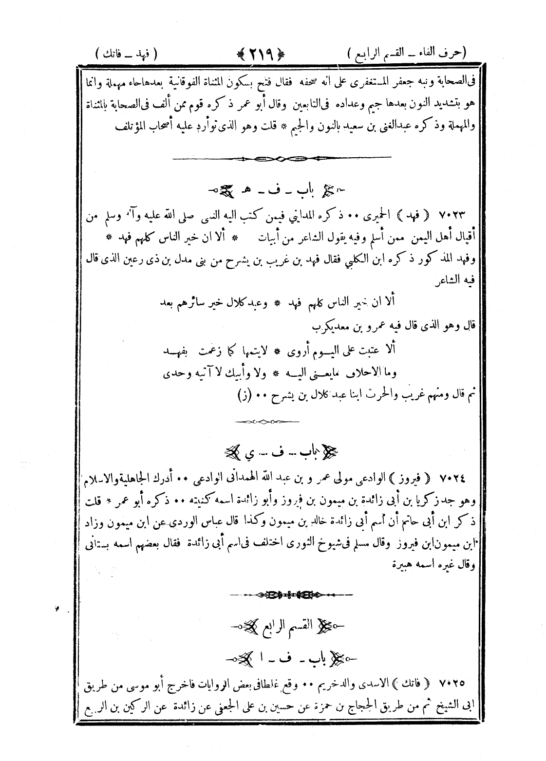 <219> في الصحابة ونبه جعفر المستغفري على انه صحفه فقال فتح بسكون المثناة الفوقانية بعدها حاء مهملة وانما هو بتشديد النون بعدها جيم وعداده في التابعين وقال أبو عمر ذكره قوم ممن ألف في الصحابة بالمثناة والمهملة وذكره عهد الغنى بن سعيد بالنون والجيم قلت هو الذي توارد عليه أصحاب المؤتلف الفاء بعدها الهاء فهد الحميري ذكره المدائني فيمن كتب اليه النبي صلى الله عليه وسلم من أقيال أهل اليمن ممن اسلم وفيه يقول الشاعر من أبيات الا ان خير الناس كلهم فهد وفهد المذكور ذكره بن الكلبي فقال فهد بن عريب بن ليشرح من بني مدل بن ذي رعين الذي قال فيه الشاعر الا ان خير الناس كلهم فهد وعبد كلال خير سائرهم بعد قال وهو الذي قال فيه عمرو بن معد يكرب الا عتبت على اليوم أروى لآتيها كما زعمت بفهد وما الاخلاف ما نعنى اليه ولا وأبيك لا آتيه وحدى ثم قال ومنهم عريب والحارث ابنا عبد كلال بن ليشرح الفاء بعدها الياء فيروز الوداعي مولى عمر بن عبد الله الهمداني الوادعي أدرك الجاهلية والإسلام وهو جد زكريا بن أبي زائدة بن ميمون بن فيروز وأبو زائدة اسمه كنيته ذكره أبو عمر قلت ذكر بن أبي حاتم ان اسم أبي زائدة خالد بن ميمون وكذا قال عباس الدوري عن بن ميمون وزاد بن ميمون بن فيروز وقال مسلم في شيوخ الثوري اختلف في اسم أبي زائدة فقال بعضهم اسمه بستاني وقال غيره اسمه هبيرة القسم الرابع الفاء بعدها الألف فاتك الأسدي والد خريم وقع غلطا في بعض الروايات فاخرج أبو موسى من طريق أبي الشيخ ثم من طريق الحجاج بن حمزة عن حسين بن علي الجعفي عن زائدة عن الركين بن الربيع §