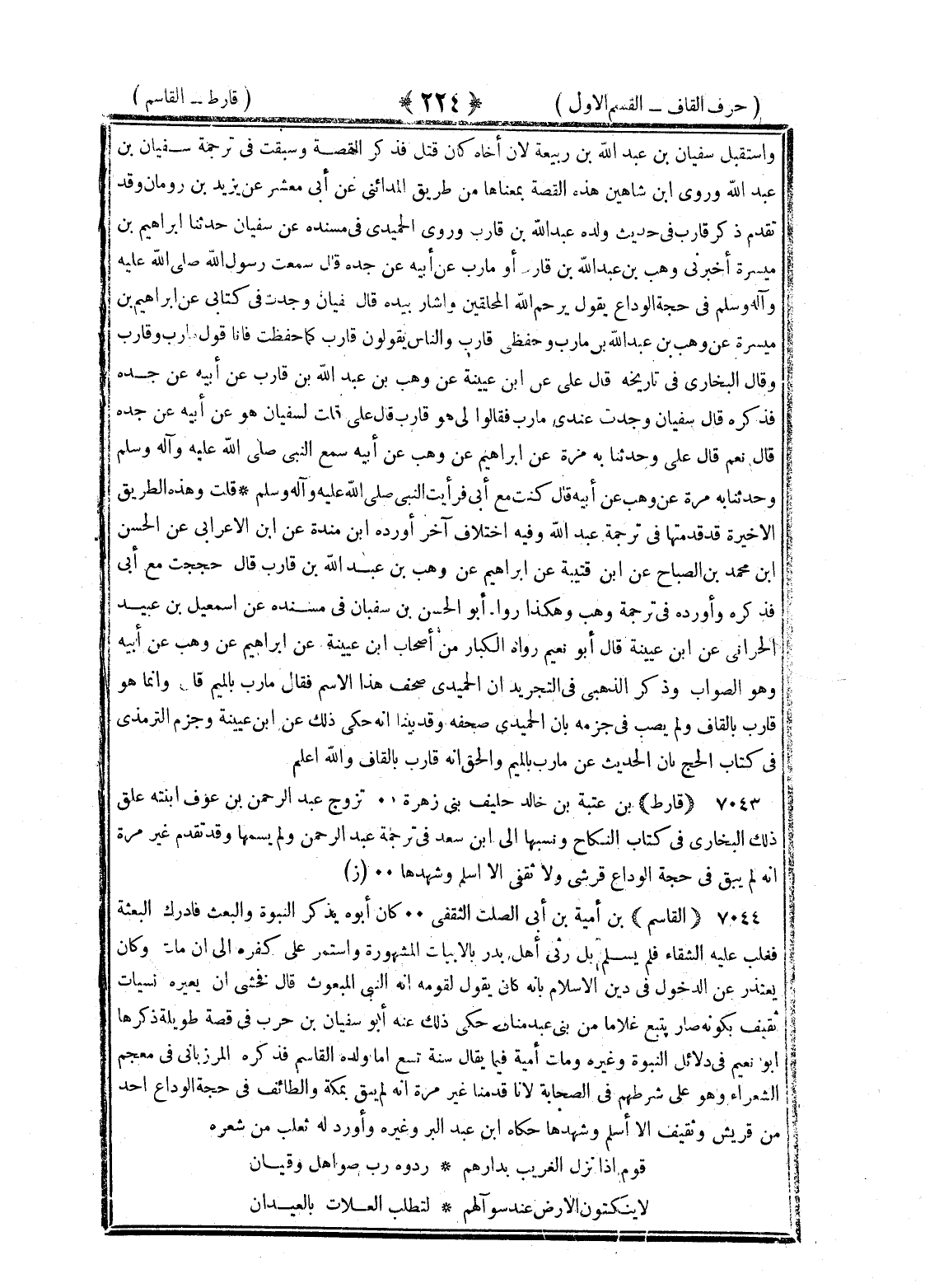 <224> واستقبل سفيان بن عبد الله بن ربيعة لان اخاه كان قتل فذكر القصة وسبقت في ترجمة سفيان بن عبد الله وروى بن شاهين هذه القصة بمعناها من طريق المدائني عن أبي معشر عن يزيد بن رومان وقدم تقدم ذكر قارب في حديث ولده عبد الله بن قارب وروى الحميدي في مسنده عن سفيان حدثنا إبراهيم بن ميسرة أخبرني وهب بن عبد الله بن قارب أو مارب عن أبيه عن جده قال سمعت رسول الله صلى الله عله وآله وسلم في حجة الوداع يقول يرحم الله المحلقين وأشار بيده قال سفيان وجدت في كتابي عن إبراهيم بن ميسرة عن وهب بن عبد الله بن مارب وحفظي قارب والناس يقولون قارب كما حفظت فانا أقول مارب وقارب وقال البخاري في تاريخه قال علي بن أبي عيينة عن وهب بن عبد الله بن قارب عن أبيه عن جده فذكره قال سفيان وجدت عندي مارب فقالوا لي هو قارب قال علي قلت لسفيان هو عن أبيه عن جده قال نعم قال علي وحدثنا به مرة عن بن إبراهيم عن وهب عن أبيه سمع النبي صلى الله عليه وسلم وحدثنا به مرة عن وهب عن أبيه قال كنت مع أبي فرأيت النبي صلى الله عليه وسلم قلت وهذه الطريق الأخيرة قد قدمتها في ترجمة عبد الله وفيه اختلاف آخر أورده بن منده عن بن منده عن بن الأعرابي عن الحسن بن محمد بن الصباح عن بن قتيبة عن إبراهيم عن وهب بن عبد الله بن قارب قال حججت مع أبي فذكره وأورده في ترجمة وهب وهكذا رواه أبو الحسن بن سفيان في مسنده عن إسماعيل بن عبيد الحراني عن بن عيينة قال أبو نعيم رواه الكبار من أصحاب بن عيينة عن إبراهيم عن وهب عن أبيه وهو الصواب وذكر الذهبي في التجريد ان الحميدي صحف هذا الاسم فقال ما رب بالميم قال وانما هو قارب بالقاف ولم يصب في جزمه بان الحميدي صحفه وقد بينا انه حكى ذلك عن بن عيينة وجزم الترمذي في كتاب الحج بان الحديث عن مارب بالميم والحق انه قارب بالقاف والله اعلم قارظ بن عتبة بن خالد حليف بني زهرة تزوج عبد الرحمن بن عوف ابنته علق ذلك البخاري في كتاب النكاح ونسبها الى بن سعد في ترجمة عبد الرحمن ولم يسمها وقد تقدم غير مرة انه لم يبق في حجة الوداع قرشي ولا ثقفي الا اسلم وشهدها القاسم بن أمية بن أبي الصلت الثقفي وكان أبوه يذكر النبوة والبعث فأدرك البعثة فغلت عليه الشقاء فلم يسلم بل رثى أهل بدر بالابيات المشهورة واستمر على كفره الى ان مات وكان يعتذر عن الدخول في دين الإسلام بأنه كان يقول لقومه انا النبي المبعوث قال فخشى ان يعيره بسيئات ثقيف بكونه صار يتبع غلاما من بني عبد مناف حكى ذلك عنه أبو سفيان بن حرب في قصة طويلة ذكرها أبو نعيم في دلائل النبوة وغيره ومات أمية فيما يقال سنة تسع اما ولده القاسم فذكره المرزباني في معجم الشعراء وهو على شرطهم في الصحابة لأنا قدمنا غير مرة انه لم يبق بمكة والطائف في حجة الوداع أحد من قريش وثقيف الا اسلم وشهدها حكاه بن عبد البر وغيره وأورد له ثعلب من شعره قوم إذا نزل الغريب بدارهم ردوه رب صواهل وقيان لا ينكتون الأرض عند سؤالهم كمطلب العلات بالعيدان §