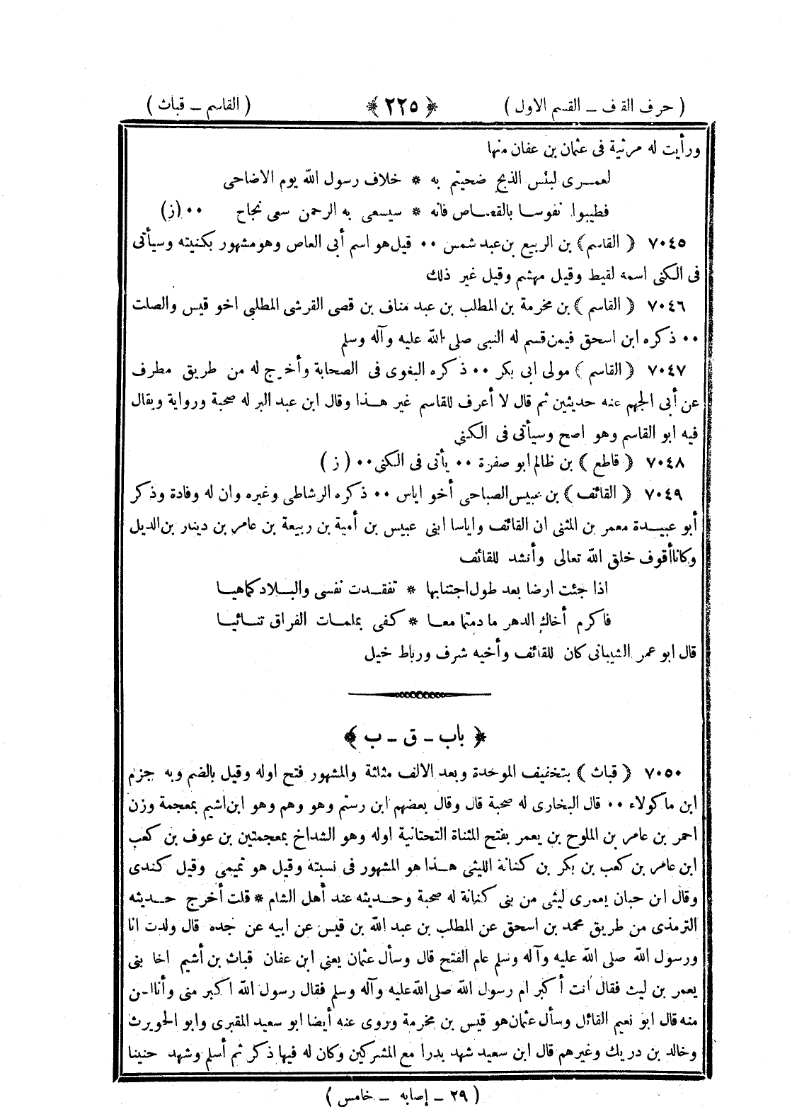 <225> ورأيت له مرثية في عثمان بن عفان منها لعمري لبئس الذبح ضحيتم به حلاف رسول الله يوم الأضاحي فطيبوا نفوسا بالقصاص فإنه سيسعى به الرحمن سعى نجاح القاسم بن الربيع بن عبد شمس قيل هو اسم أبي العاص وهو مشهور بكنيته وسيأتي في الكنى اسمه لقيط وقيل منهم وقيل غير ذلك القاسم بن مخرمة بن المطلب بن عبد مناف بن قصي القرشي المطلبى أخو قيس والصلت ذكره بن إسحاق فيمن قسم له النبي صلى الله عليه وسلم القاسم مولى أبي بكر ذكره البغوي في الصحابة واخرج له من طريق مطرف عن أبي الجهم عنه حديثين ثم قال لا اعرف للقاسم غير هذا وقال بن عبد البر له صحبة ورواية ويقال فيه أبو القاسم وهو أصح وسيأتي في الكنى قاطع بن ظالم أبو صفرة يأتي في الكنى القائف بن عبيس الصباحي أخو إياس ذكره الرشاطي وغيره وان له وفادة وذكر أبو عبيدة معمر بن المثنى بن القائف واياسا ابنا عبيس بن أمية بن ربيعة بن عامر بن ذبيان بن الديل وكانا افوق خلق الله تعالى وأنشد للقائف إذا جئت أرضا بعد طول اجتنابها تفقدت نفسي والبلاد كما هيا فأكرم أخاك الدهر ما دمتما معا كفى بملمات الفراق تنائيا قال أبو عمرو الشيباني كان للقائف وأخيه شرف ورباط خيل القاف بعدها الباء قباث بتخفيف الموحدة وبعد الألف مثلثة والمشهور فتح أوله وقيل بالضم وبه جزم بن ماكولا قال البخاري له صحبة قال وقال بعضهم بن رسيم وهو وهم وهو بن أشيم بمعجمة وزن احمر بن عامر بن الملوح بن يعمر بفتح المثناة التحتانية أوله وهو الشداخ بمعجمتين بن عوف بن كعب بن عامر بن ليث بن بكر بن كنانة الليثي هذا هو المشهور في نسبه وقيل هو تميمي وقيل كندي وقال بن حبان يعمري ليثي من بني كنانة له صحبة وحديثه عند أهل الشام قلت اخرج حديثه الترمذي من طريق محمد بن إسحاق عن المطلب بن عبد الله بن قيس عن أبيه عن جده قال ولدت انا رسول الله عام الفتح قال وسأل عثمان يعني ان عفان قباث بن أشيم أخا بني يعمر بن ليث فقال أنت أكبر أم رسول الله صلى الله عليه وسلم فقال رسول الله أكبر مني وانا اسن منه قال أبو نعيم القائل وسأل عثمان هو قيس بن مخرمة وروى عنه أيضا أبو سعيد المقبري وأبو الحويرث وخالد بن دريك وغيرهم وقال ابن سعد شهد بدرا مع المشركين وكان له فيها ذكر ثم اسلم وشهد حنينا §