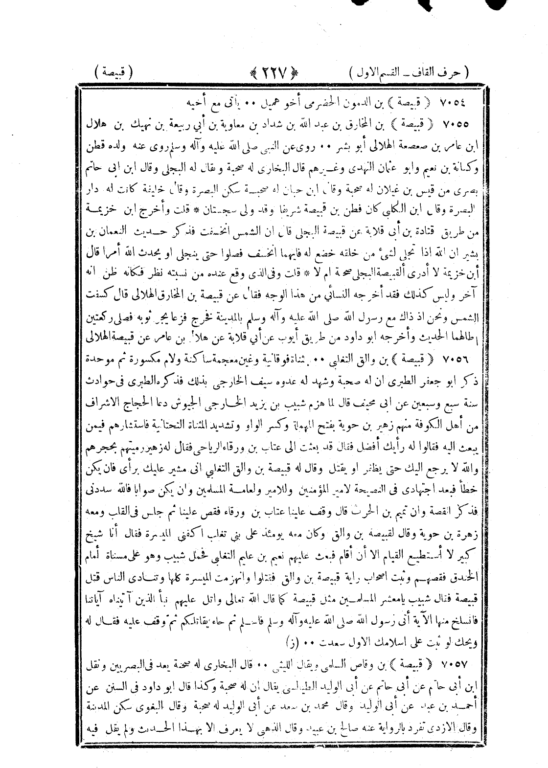 <227> قبيصة بن الدمون الحضرمي أخو هميل يأتي مع أخيه قبيصة بن المخارق بن عبد الله بن شداد بن معاوية بن أبي ربيعة بن نهيك بن هلال بن عامر بن صعصعة الهلالي أبو بشر روى عن النبي صلى الله عليه وسلم روى عنه ولده قطن وكنانة بن نعيم وأبو عثمان النهدي وغيرهم قال البخاري له صحبة ويقال له البجلي وقال بن أبي حاتم بصري من قيس غيلان له صحبة وقال بن حبان له صحبة سكن البصرة وقال خليفة كانت له دار بالبصرة وقال بن الكلبي كان قطن بن قبيصة شريفا وقد ولى سجستان قلت واخرج بن خزيمة من طريق قتادة عن أبي قلابة عن قبيصة البجلي قال ان الشمس انخسفت فذكر حديث النعمان بن بشير ان الله إذا تجلى لشيء من خلقه خضع له فأيهما انخسف فصلوا حتى ينجلي أو يحدث الله أمرا وقال بن خزيمة لا أدري القبيصة البجلي صحبة أم لا قلت وفي الذي وقع عنده من نسبته نظر فكأنه ظن انه آخر وليس كذلك فقد أخرجه من هذا الوجه فقال عن قبيصة بن المخارق الهلالي قال كسفت الشمس ونحن إذ ذاك مع رسول الله صلى الله عليه وسلم بالمدينة فخرج فزعا يجر ثوبه فصلى ركعتين اطالهما الحديث وأخرجه أبو داود من طريق أيوب عن أبي قلابة عن هلال بن عامر عن قبيصة الهلالي قبيصة بن والق التغلبي بمثناة فوقانية وغين معجمة ساكنة ولام مكسورة ثم موحدة ذكرا أبو جعفر الطبري ان له صحبة وشهد له عدوه شبيب الخارجي بذلك فذكر الطبري في حوادث سنة سبع وسبعين عن أبي مخنف قال لما هزم شبيب بن يزيد الخارجي الجيوش دعا الحجاج الأشراف من أهل الكوفة منهم زهرة بن حوية بفتح المهملة وكسر الواو وتشديد المثناة التحتانية فاستشارهم فيمن يبعث اليه فقالوا له رأيك أفضل فقال قد بعثت الى عتاب بن ورقاء الرياحي فقال زهرة رميتهم بحجرهم والله لا يرجع إليك حتى يظفر أو يقتل وقال له قبيصة بن والق التغلبي اتى مشير عليك برأي فان يكن خطأ فبعد اجتهادي في النصيحة لأمير المؤمنين وللأمير ولعامة السلمين وان يكن صوابا فالله سددني فذكر القصة وان تميم بن الحارث قال وقف علينا عتاب بن ورقاء فقص علينا ثم جلس في القلب ومعه زهرة بن حوية وقال لقبيصة بن والق وكان معه يومئذ على بني تغلب اكفني الميسرة فقال انا شيخ كبير لا أستطيع القيام الا ان أقام فبعث عليهم نعيم بن عليم التغلبي فحمل شبيب وهو على مسناة امام الخندق ففضهم وثبت أصحاب راية قبيصة بن والق فقتلوا وانهزمت الميسرة كلها وتنادى الناس قتل قبيصة فقال شبيب يا معشر المسلمين مثل قبيصة كما قال الله تعالى واتل عليهم نبأ الذي آتيناه آياتنا فانسلخ منها الآية اتى رسول الله صلى الله عليه وسلم وعلى آله وسلم فاسلم ثم جاء يقاتلكم ثم وقف عليه فقال له ويحك لو ثبت على اسلامك الأول سعدت قبيصة بن وقاص السلمي ويقال الليثي قال البخاري له صحبة يعد في البصريين ونقل بن أبي حاتم عن أبي الوليد الطيالسي يقال ان له صحبة وكذا قال أبو داود في السنن عن احمد بن عبيد عن أبي الوليد وقال محمد بن سعد عن أبي الوليد له صحبة وقال البغوي سكن المدينة وقال الأزدي تفرد بالرواية عنه صالح بن عبيد وقال الذهبي لا يعرف الا بهذا الحديث ولم يقل فيه §