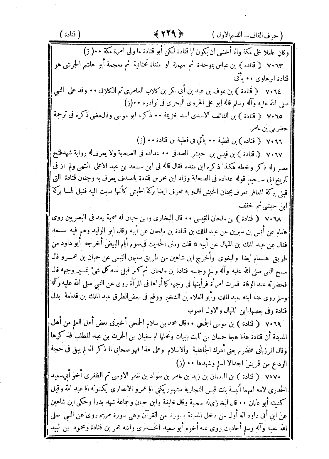 <229> وكان عاملا على مكة وانا أخشى ان يكون أبا قتادة لكن أبو قتادة ما ولى إمرة مكة قتادة بن عباس بموحدة ثم مهملة أو مثناة تحتانية ثم معجمة أبو هاشم الجرشي هو قتادة الرهاوي يأتي قتادة بن عوف بن عبد بن أبي بكر بن كلاب العامري ثم الكلابي وفد على النبي صلى الله عليه وسلم قاله أبو علي الهجري في نوادره قتادة بن القائف الأسدي أسد خزيمة ذكره أبو موسى وقال مضى ذكره في ترجمة حضرمي بن عامر قتادة بن قطبة يأتي في قطبة بن قتادة قتادة بن قيس بن حبشي الصدفي عداده في الصحابة ولا يعرف له رواية شهد فتح مصر وله ذكر وخطة هكذا ذكره بن منده فقال قاله لي بن سعد بن عبد الأعلى انتهى ولم ار في تاريخ أبي سعيد قوله عداده في الصحابة وزاد ان محرس قتادة بالصدف يعرف به وجنان قتادة التي قبلي بركة المعافر تعرف بجنان الحبش قال وبه تعرف أيضا بركة الحبش كأنها نسبت اليه فقيل لها بركة بن حبشي ثم خفف قتادة بن ملحان القيسي قال البخاري وابن حبان له صحبة يعد في البصريين روى همام عن أنس بن سيرين عن عبد الملك بن قتادة بن ملحان عن أبيه وقال أبو الوليد وهم فيه بن سعد فقال عن عبد الملك بن المنهال عن أبيه قلت ومتن الحديث في صوم أيام البيض أخرجه أبو داود من طريق همام أيضا والبغوي واخرج بن شاهين من طريق سليمان التيمي عن حيان بن عمرو قال مسح النبي صلى الله عليه وسلم وآله وجه قتادة بن ملحان ثم كبر فبلى منه كل شيء غير وجهه قال فحضرته عند الوفاة فمرت امرأة فرأيتها في وجهه كما اراها في المرآة روى عن النبي صلى الله عليه وسلم روى عنه ابنه عبد الملك وأبو العلاء بن الشخير ووقع في بعض الطرق عبد الملك بن قدامة بدل قتادة وفي بعضها بن المنهال والأول اصوب قتادة بن موسى الجمحي قال محمد بن سلام الجمحي أخبرني بعض أهل العلم من أهل المدينة ان قتادة هذا هجا حسان بن ثابت بأبيات ونحلها أبا سفيان بن عبد المطلب فذكرها وقال المرزباني مخضرم يعني أدرك الجاهلية والإسلام وعلى هذا فهو صحابي لما ذكر انه لم يبق في حجة الوداع من قريش أحد الا اسلم وشهدها قتادة بن النعمان بن زيد بن عامر بن سواد بن ظفر الأوسي ثم الظفري أخو أبي سعيد الخدري لامه أمهما أنيسة بنت قيس النجاريه مشهور يكنى أبا عمرو الأنصاري يكنونه أبا عبد الله وقيل كنيته أبو عثمان قال البخاري له صحبة وقال خليفة وابن حبان وجماعة شهد بدرا وحكى ابن شاهين عن ابن أبي داود انه أول من دخل المدينة بسورة من القرآن وهي سورة مريم روى عن النبي صلى الله عليه وسلم أحاديث روى عنه اخوه أبو سعيد الخدري وابنه عمر بن قتادة ومحمود بن لبيد §