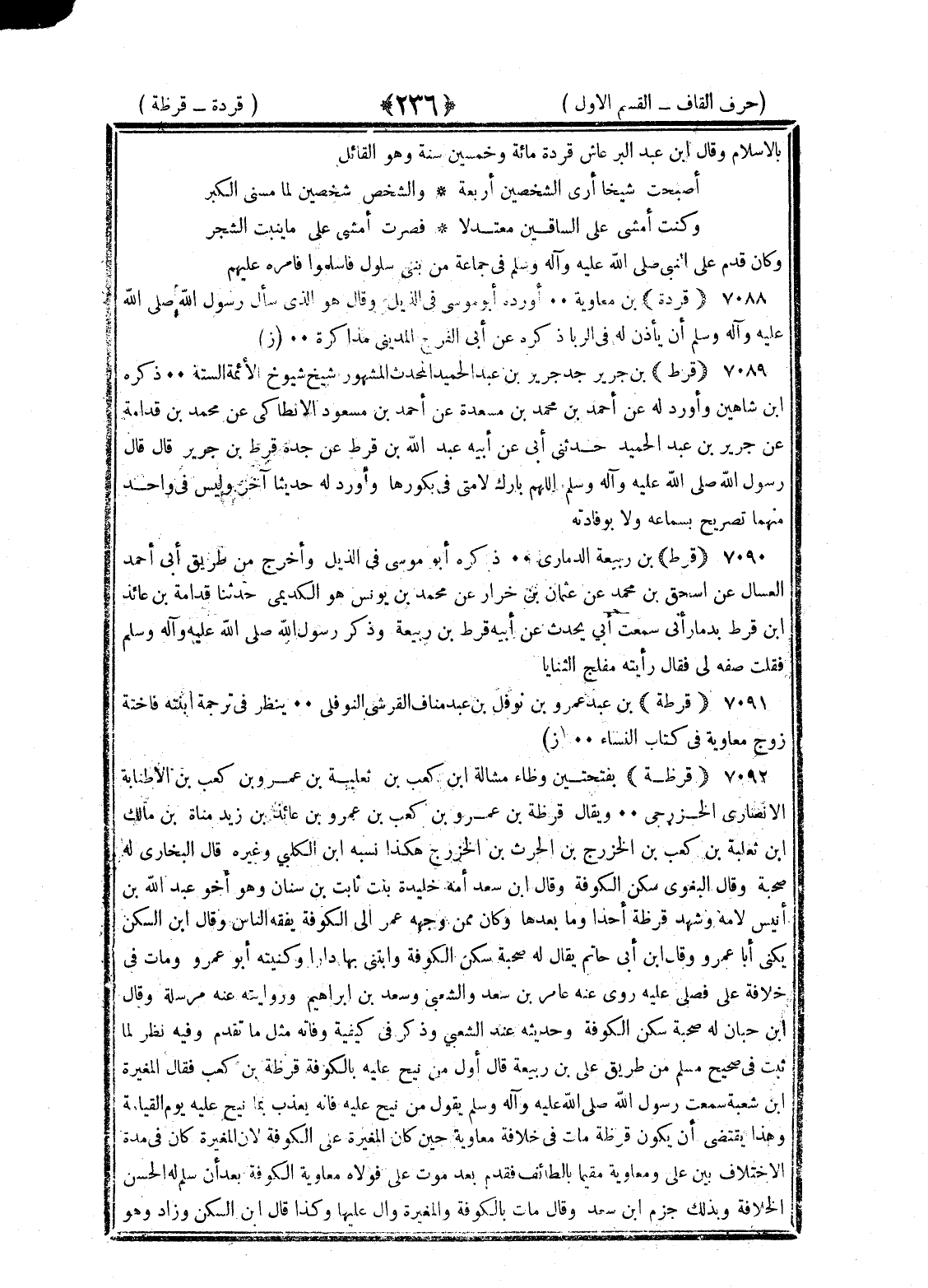 <236> بالإسلام وقال بن عبد البر عاش قردة مائة وخمسين سنة وهو القائل أصبحت شيخا أرى الشخصين أربعة والشخص شخصين لما مسنى الكبر وكنت امشي على الساقين معتدلا فصرت أمشي على ما ينبت الشجر وكان قدم على النبي صلى الله عليه وسلم في جماعة من بني سلول فأسلموا فأمره عليهم قردة بن معاوية أورده أبو موسى في الذيل وقال هو الذي سأل رسول الله صلى الله عليه وسلم ان يأذن له في الربا ذكره بن أبي الفرج المديني مذاكرة قرط بن جرير جد جرير بن عبد الحميد المحدث المشهور شيوخ شيروخ الأئمة الستة ذكره بن شاهين وأورد له عن احمد بن محمد بن مسعدة عن احمد بن مسعود الأنطاكي عن محمد بن قدامة عن جرير بن عبد الحميد حدثني أبي عن أبيه عبد الله بن قرط عن جده قرط بن جرير قال قال رسول الله صلى الله عليه وسلم اللهم بارك لامتي في بكورها وأورد له حديثا آخر وليس في واحد منهما تصريح بسماعه ولا بوفادته قرط بن ربيعة الذماري ذكره أبو موسى في الذيل واخرج من طريق أبي احمد العسال عن إسحاق بن عثمان بن خرزاذ عن محمد بن يونس هو الكديمي حدثنا قدامة بن عائذ بن قرط بذمار اني سمعت أبي يحدث عن أبيه قرط بن ربيعة وذكر رسول الله صلى الله عليه وسلم فقلت صفه لي فقال رأيته مفلج الثنايا قرظة بن عبد عمرو بن نوفل بن عبد مناف القرشي النوفلي ينظر في ترجمة ابنته فاخته زوج معاوية في كتاب النساء قرظة بفتحتين وظاء مشالة بن كعب بن ثعلبة بن عمرو بن كعب بن الاطنابة الأنصاري الخزرجي ويقال قرظة بن عمرو بن كعب بن عمرو بن عائذ بن زيد مناة بن مالك بن ثعلبة بن كعب بن الخزرج بن الحارث بن الخزرج هكذا نسبه بن الكلبي وغيره قال البخاري له صحبة وقال البغوي سكن الكوفة وقال بن سعد أمه خليدة بنت ثابت بن سنان وهو أخو عبد الله بن أنيس لامه وشهد قرظة أحدا وما بعدها وكان ممن وجهه عمر الى الكوفة يفقه الناس وقال بن السكن يكنى أبا عمرو وقال بن أبي حاتم يقال له صحبة سكن الكوفة وابتنى بها دارا وكنيته أبو عمر ومات في خلافة علي فصلى عليه روى عنه عامر بن سعد والشعبي وسعد بن إبراهيم وروايته عنه مرسلة وقال بن حبان له صحبة سكن الكوفة وحديثه عند الشعبي وذكر في وفاته ما تقدم وفيه نظر لما ثبت في صحيح من طريق علي بن ربيعة قال أول من نيح عليه بالكوفة قرظة بن كعب فقال المغيرة بن شعبة سمعت رسول الله صلى الله عليه وسلم يقول من نيح عليه فإنه يعذب بما نيح عليه يوم القيامة وهذا يقتضى ان يكون قرظة مات في خلافة معاوية حين كان المغيرة على الكوفة لان المغيرة كان في مدة الاختلاف بين علي ومعاوية مقيما بالطائف فقدم بعد موت علي فولاه معاوية الكوفة بعد ان اسلم له الحسن الخلافة وبذلك جزم بن سعد وقال مات بالكوفة والمغيرة وال عليها وكذا قال بن السكن وزاد وهو §