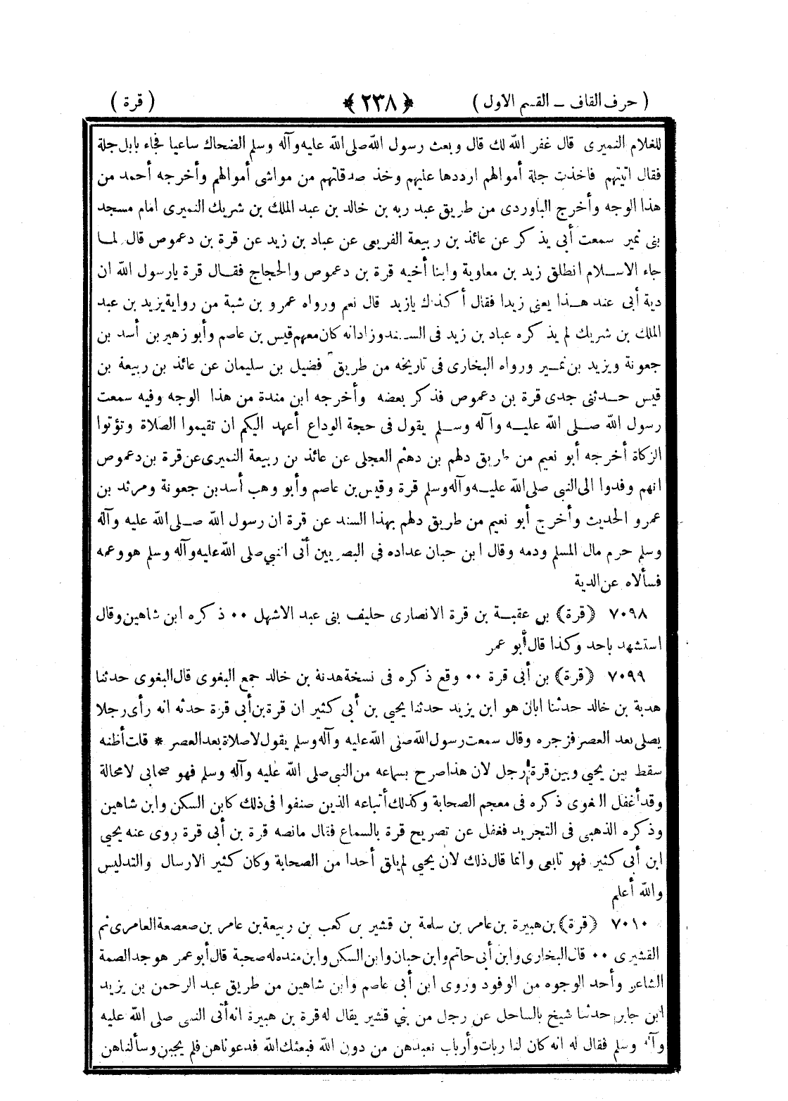 <238> للغلام النميري قال غفر الله لك قال وبعث رسول الله صلى الله عليه وسلم الضحاك ساعيا فجاء بابل جلة فقال اتيتهم فاخذت جلة أموالهم ارددها عليهم وخذ صدقاتهم من مواشي أموالهم وأخرجه احمد من هذا الوجه وأخرجه الباوردي من طريق عبد ربه بن خالد بن عبد الملك بن شريك النميري امام مسجد بني نمير سمعت أبي يذكر عن عائذ بن ربيعة القريعي عن عباد بن زيد عن قرة بن دعموص قال لما جاء الإسلام انطلق زيد بن معاوية وابنا أخيه قرة بن دعموص والحجاج بن فقال قرة يا رسول الله ان دية أبي عند هذا يعني زيدا فقال اكذاك يا زيد قال نعم ورواه عمر بن شبة من رواية يزيد بن عبد الملك بن شريك لم يذكره عباد زيد في السند وزاد انه كام معهم قيس بن عاصم وأبو زهير بن أسد بن جعونة ويزيد بن نمير ورواه البخاري في تاريخه من طريق فضيل بن سليمان عن عائذ بن ربيعة بن قيس حدثني جدي قرة بن دعموص فذكر بعضه وأخرجه بن منده من هذا الوجه وفيه سمعت رسول الله صلى الله عليه وسلم يقول في حجة الوداع اعهد اليكم ان تقيموا الصلاة وتؤتوا الزكاة أخرجه أبو نعيم من طريق دلهم بن دهثم العجلي عن عائذ بن ربيعة النميري عن قرة بن دعموص انهم وفدوا الى النبي صلى الله عليه وسلم قرة وقيس بن عاصم وأبو وهب أسد بن جعونة ومرثد بن عمرو الحديث واخرج أبو نعيم من طريق دلهم بهذا السند عن قرة ان رسول الله صلى الله عليه وسلم حرم مال المسلم ودمه وقال بن حبان عداده في البصريين اتى النبي صلى الله عليه وسلم هو وعمه فسألاه عن الدية قرة بن عقبة بن قرة الأنصاري حليف بني عبد الأشهل ذكره بن شاهين وقال استشهد بأحد وكذا قال أبو عمر قرة بن أبي قرة وقع ذكره في نسخة هدبه بن خالد جمع البغوي قال البغوي حدثنا هدبة بن خالد حدثنا أبان هو بن يزيد حدثنا يحيى بن أبي كثير ان قرة بن أبي قرة حدثه انه رأى رجلا يصلى بعد العصر فزجره وقال سمعت رسول الله صلى الله عليه وسلم يقول لا صلاة بعد العصر قلت أظنه سقط بين يحيى وبين قرة رجل لان هذا صرح بسماعه من النبي صلى الله عليه وسلم فهو صحابي لا محالة وقد اغفل البغوي ذكره في معجم الصحابة وكذلك اتباعه الذين صنفوا في ذلك ذلك كابن السكن وابن شاهين وذكره الذهبي في التجريد فنقل عن تصريح قرة بالسماع فقال ما نصه قرة بن أبي قرة روى عنه يحيى بن أبي كثير فهو تابعي وانما قال ذلك لان يحيى لم يلق أحدا من الصحابة وكان كثير الإرسال والتدليس والله اعلم قرة بن هبيرة بن عامر بن سلمة بن قشير بن كعب بن ربيعة بن عامر بن صعصعة العامري ثم القشيري قال البخاري وابن أبي حاتم وابن حبان وابن السكن وابن منده له صحبة قال أبو عمر هو جد الصمة الشاعر واحد الوجوه من الوفود وروى بن أبي عاصم وابن شاهين من طريق عبد الرحمن بن يزيد بن جابر حدثنا شيخ بالساحل عن رجل من بني قشير يقال له قرة بن هبيرة انه اتى النبي صلى الله عليه وسلم فقال له انه كان لنا ربات وارباب نعبدهن من دون الله فبعثك الله فدعوناهن فلم يجبن وسألناهن §