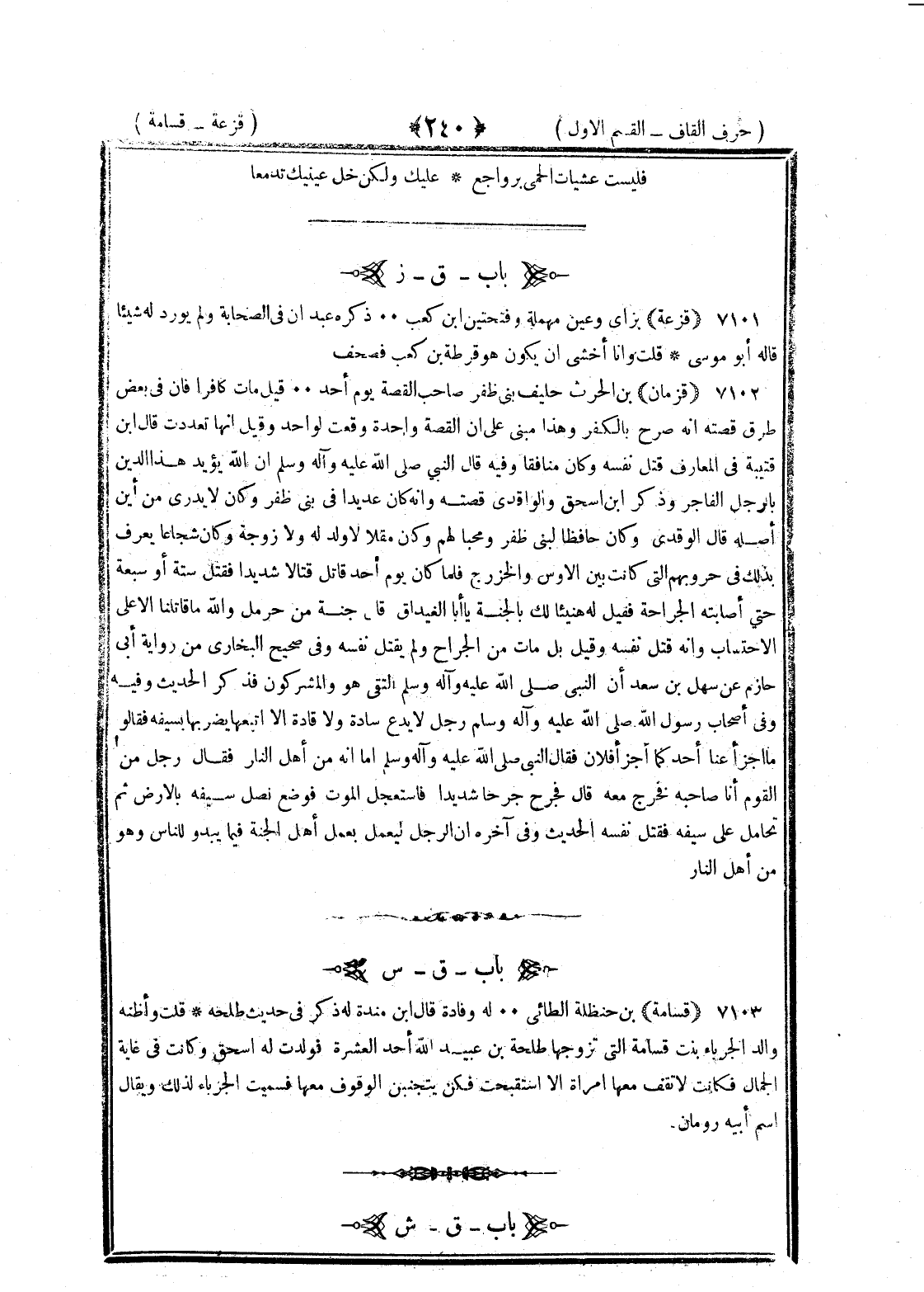 <240> فليست عشيات الحمى برواجع عليك ولكن خل عينيك تدمعا القاف بعدها الزاي قزعة بزاي وعين مهملة وفتحتين بن كعب ذكره عبدان في الصحابة ولم يورد له شيئا قاله أبو موسى قلت وانا أخشى ان يكون هو قرظة بن كعب فصحف قزمان بن الحارث حليف بني ظفر صاحب القصة يوم أحد قيل مات كافرا فان في بعض طرق قصته انه صرح بالكفر وهذا مبنى على ان القصة واحدة وقعت لواحد وقيل انها تعددت قال بن قتيبة في المعارف قتل نفسه وكان منافقا وفيه قال النبي صلى الله عليه وسلم ان الله يؤيد هذا الدين بالرجل الفاجر وذكر بن إسحاق والواقدي قصته وانه كان عزيزا في بني ظفر وكان لا يدري من أين أصله قال الواقدي وكان حافظا لبني ظفر ومحبا لهم وكان مقلا لا ولد له ولا زوجة وكان شجاعا يعرف بذلك في حروبهم التي كانت بين الأوس والخزرج فلما كان يوم أحد قاتل قتالا شديدا فقتل ستة أو سبعة حتى أصابته الجراحة فقيل له هنيئا لك بالجنة يا أبا الغيداق قال جنة من حرمل والله ما قاتلنا الا على الاحساب وقيل انه قتل نفسه وقيل بل مات من الجراح ولم يقتل نفسه وفي صحيح البخاري من رواية أبي حازم عن سهل بن سعد ان النبي صلى الله عليه وسلم التقي هو والمشركون فذكر الحديث وفيه وفي أصحاب رسول صلى الله عليه وسلم رجل لا يدع شاذة ولا فاذة الا اتبعها يضربها بسيفه فقالوا ما اجزأ عنا أحد كما اجزأ فلان فقال النبي صلى الله عليه وسلم اما انه من أهل النار فقال رجل من القوم انا اصاحبه فخرج معه قال فجرح جرحا شديدا فاستعجل الموت فوضع نصل سيفه بالأرض ثم تحامل على سيفه فقتل نفسه الحديث وفي آخره ان الرجل ليعمل بعمل أهل الجنة فيما يبدو للناس وهو من أهل النار القاف بعدها السين قسامة بن حنظلة الطائي له وفادة وقال بن منده له ذكر في حديث طلحة قلت وأظنه والد الجرباء بنت قسامة التي تزوجها طلحة بن عبيد الله أحد العشرة فولدت له إسحاق وكانت في غاية الجمال فكانت لا تقف معها امرأة الا استقبحت فكن يتجنبن الوقوف معها فسميت الجرباء لذلك ويقال اسم أبيه رومان القاف بعدها الشين §